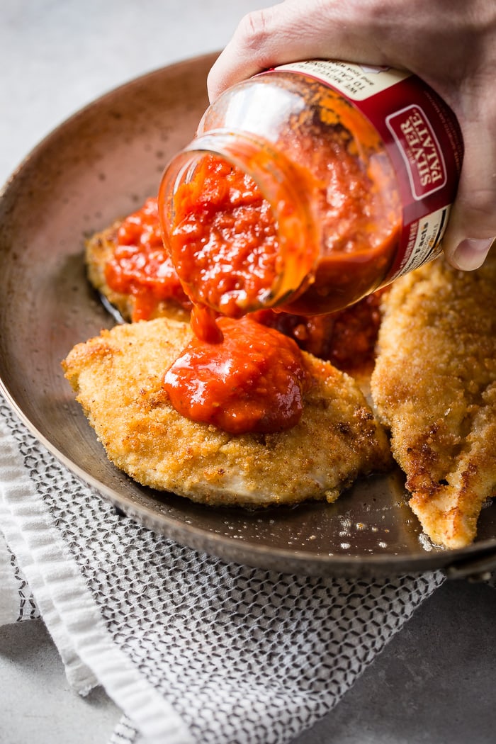 Abbiamo provato pangrattato, pangrattato condito, panko e panko condito e torniamo sempre al nostro stesso segreto per preparare una ricetta della parmigiana di pollo facile e veloce e sono abbastanza sicuro che adorerai il nostro modo e rimarrai agganciato per sempre. Pollo croccante e dorato perfettamente affogato in una marinara leggera e saporita e mozzarella che è stata cotta fino a diventare appiccicosa e deliziosa, ora è la cena che voglio!