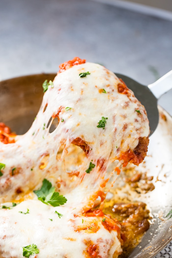Abbiamo scoperto che il purè di patate è un’ottima opzione, o ci piace davvero usare una quantità molto piccola di salsa sopra e servirla su verdure miste con un po’ di succo di limone e olio d’oliva. In quel metodo invece cerchiamo di usare meno mozzarella e più parmigiano. È così buona. Non guardare la foto ma prova questa versione se vuoi una ricetta di parmigiana di pollo più salutare.