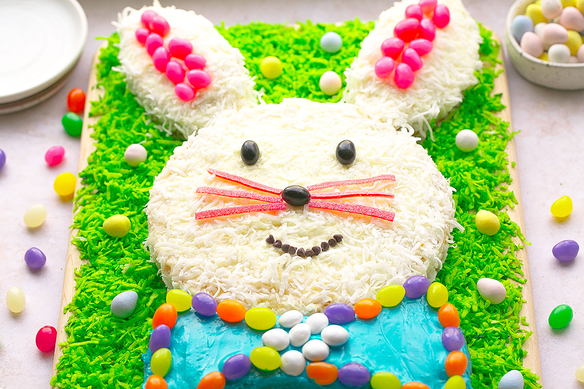 - Cocco: se ami il cocco, sentiti libero di cospargerlo generosamente sulla forma del coniglietto prima di decorare, per creare una “pelliccia!” (Questo potrebbe rendere necessario modificare alcune delle decorazioni, ad esempio le caramelle potrebbero funzionare meglio della glassa per gli occhi e i baffi).
