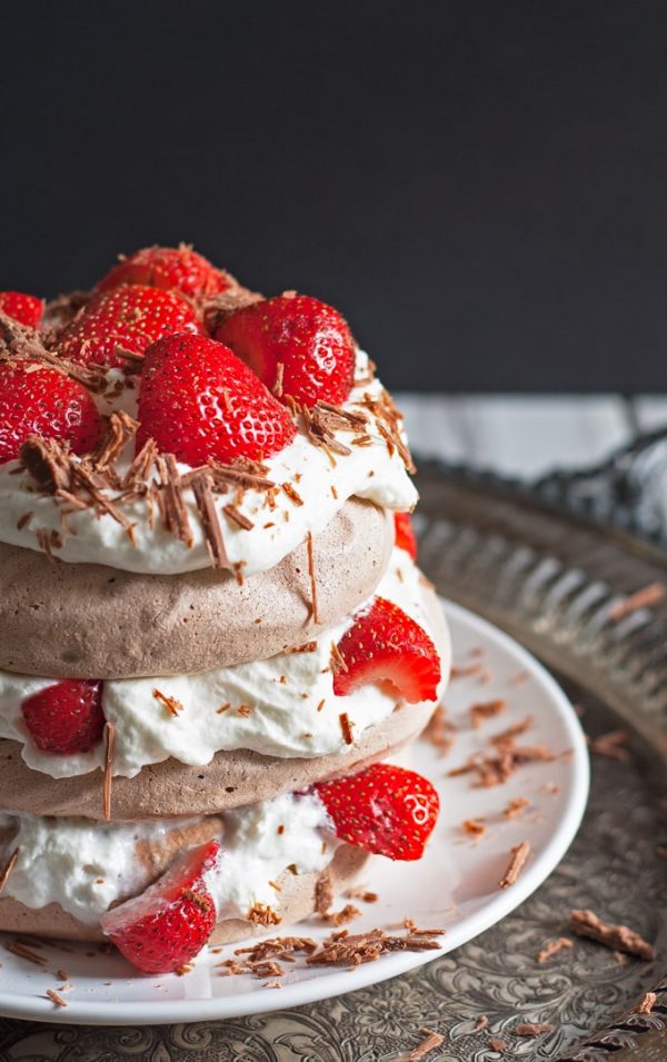 Questa torta pavlova al cioccolato è fatta con meringa al cioccolato, panna montata e fragole fresche. Questa è la ricetta di torta al cioccolato più fantasiosa di sempre!