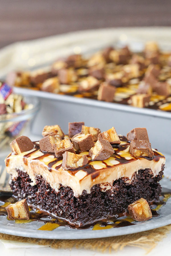 Questa torta poke è così dannatamente buona che non è nemmeno giusta. La torta al cioccolato viene imbevuta con una miscela di caramello e latte, quindi condita con panna montata al burro di arachidi.