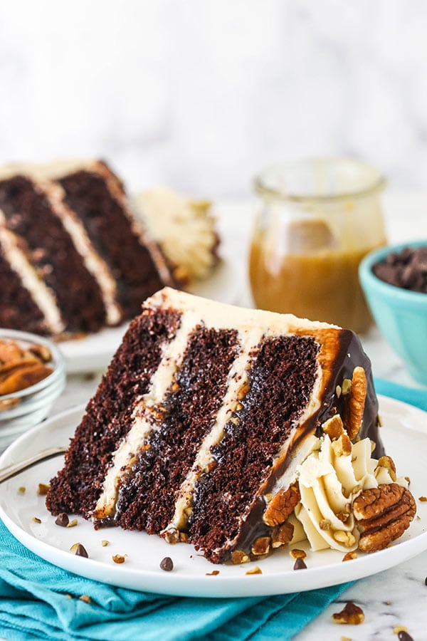Realizzata completamente da zero, questa torta al cioccolato umida è imbevuta di salsa al caramello e condita con più cioccolato, caramello e noci pecan!