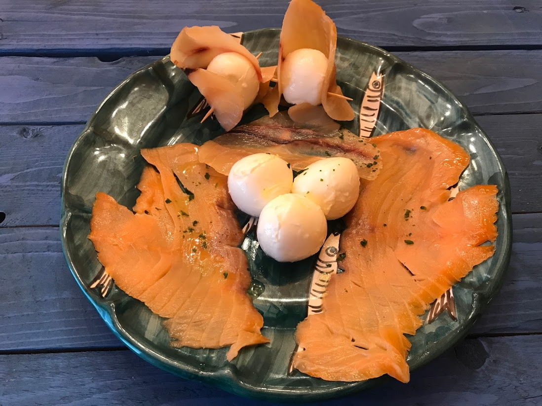 Step 1Prendiamo un piatto da portata dove adageremo tutti gli ingredienti a mo' di antipasto: prendiamo il tonno, il salmone, il pesce spada e la mozzarella di bufala. |