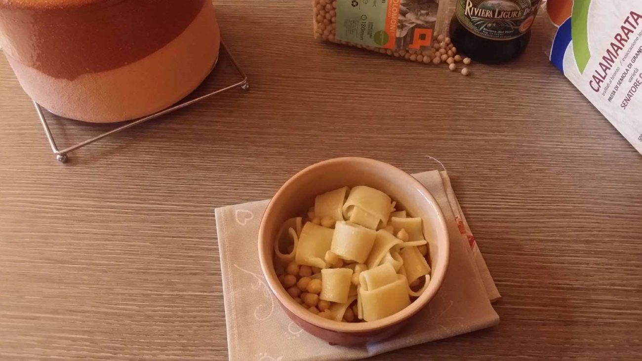 Per la realizzazione di questa ricetta ho scelto: i ceci bio della ditta Girolomoni, per cuocere sia i ceci che la pasta ho utilizzato la pentola della ditta Bionatural di Giambattista Belotti, la pasta tipo calamarata della ditta Daunia&Bio, l’olio Riviera Ligure della ditta Frantoio Sant’Agata d’Oneglia.