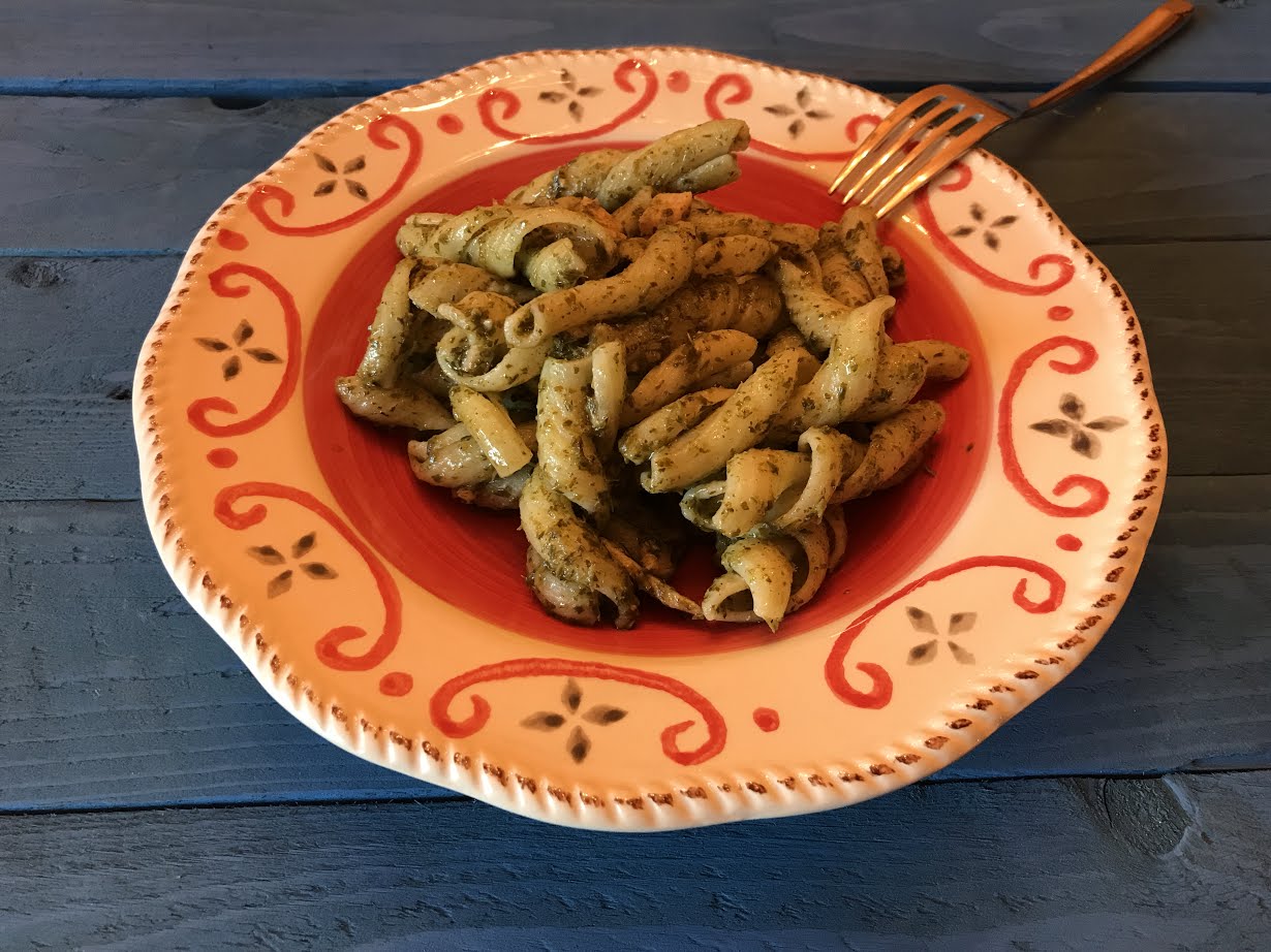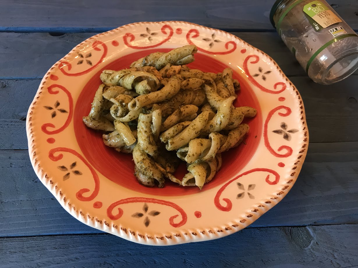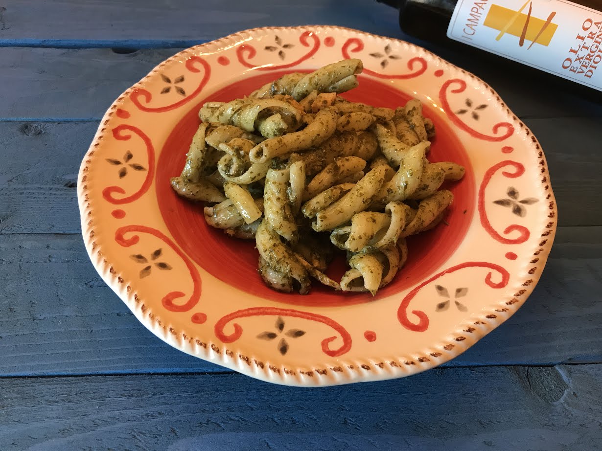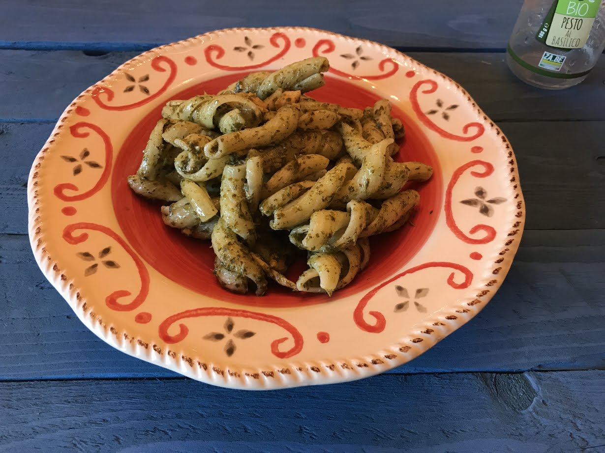 Per la realizzazione di questa ricetta ho usato come ingredienti principali: il pesto al basilico bio della ditta Za.Be Srl e l’olio extra vergine di oliva I Campacci IGP Toscano della ditta Frantoi d’Italia.