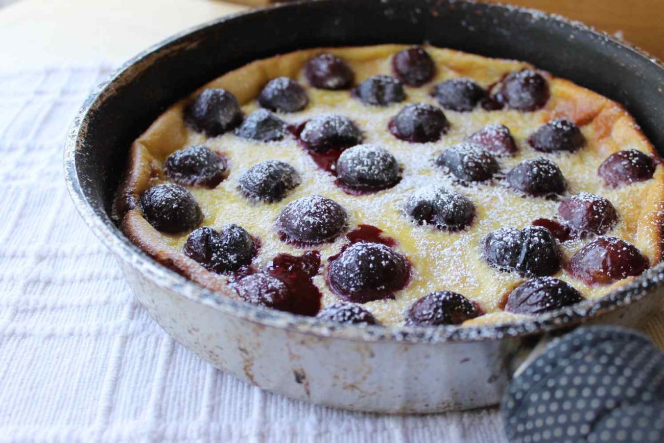 Step 3Rivestite uno stampo o una pirofila del diametro di circa 26 cm con un foglio di carta da forno e spennellatela con l'olio. Disponete le ciliegie sul fondo, poi coprite con il composto. Fate cuocere il clafoutis in forno statico già caldo a 180°C per 35 minuti, o fino a quando non sarà ben dorato in superficie. |