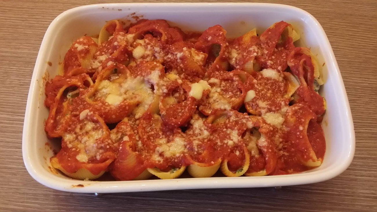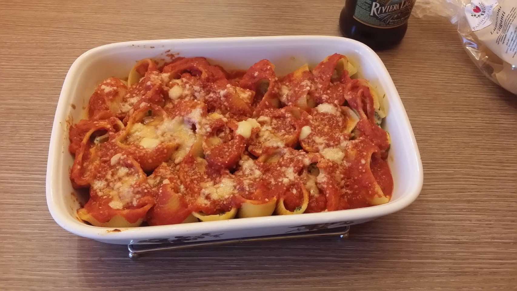 Mettiamo sul fondo della pirofila il sugo. Farciamo i conchiglioni con il ripieno e disponiamoli nella teglia, uno accanto all'altro. Condiamoli con altro sugo, una spolverata di grana e inforniamoli a 180°C fino a gratinatura. |