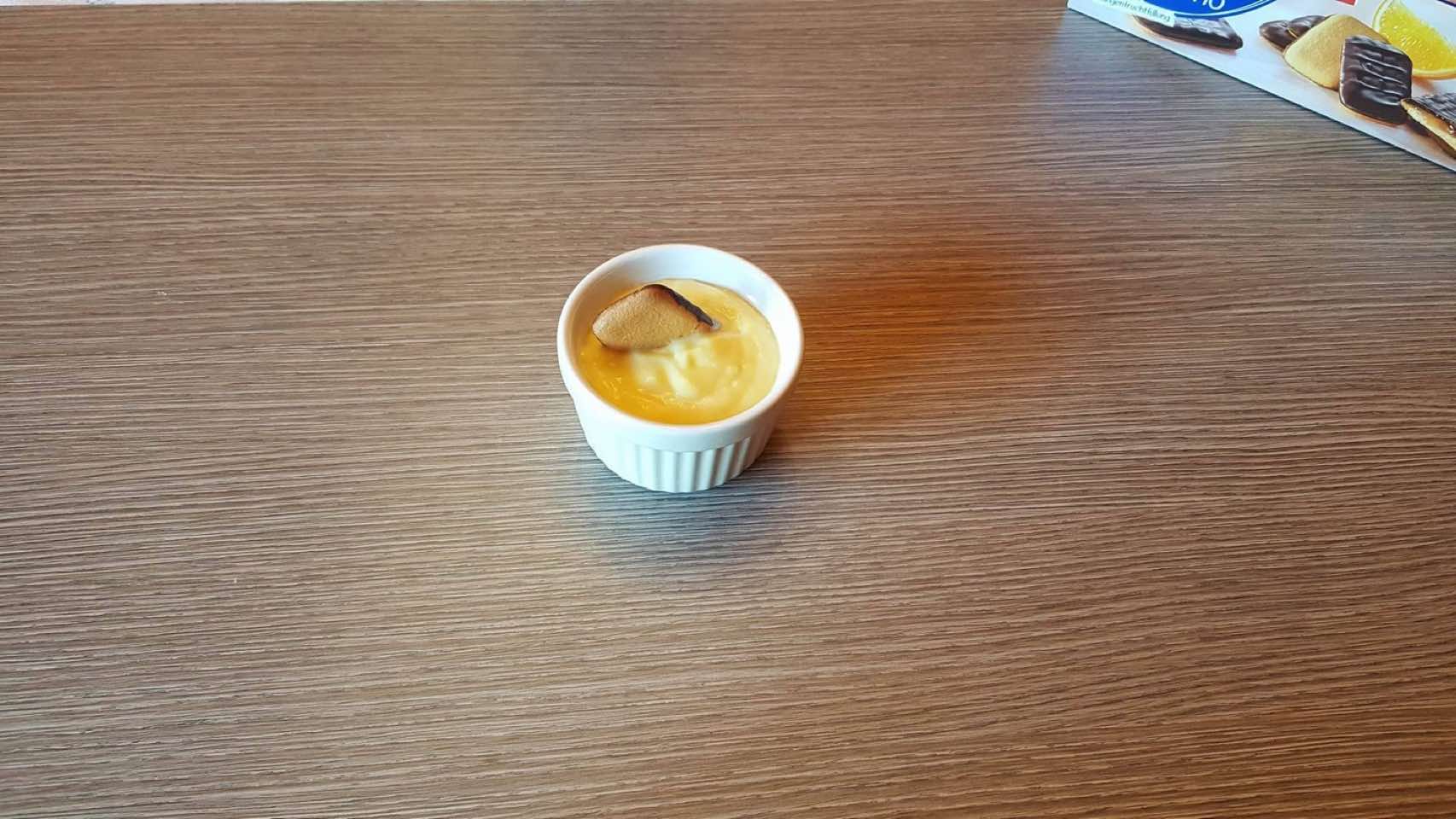 Fate raffreddare la crema all'arancia. Una volta raffreddata potete metterla in un ciotolina e come decorazione potete usare i biscotti Messino della linea Bahlsen. E' ottima da gustare con il cucchiaino. |