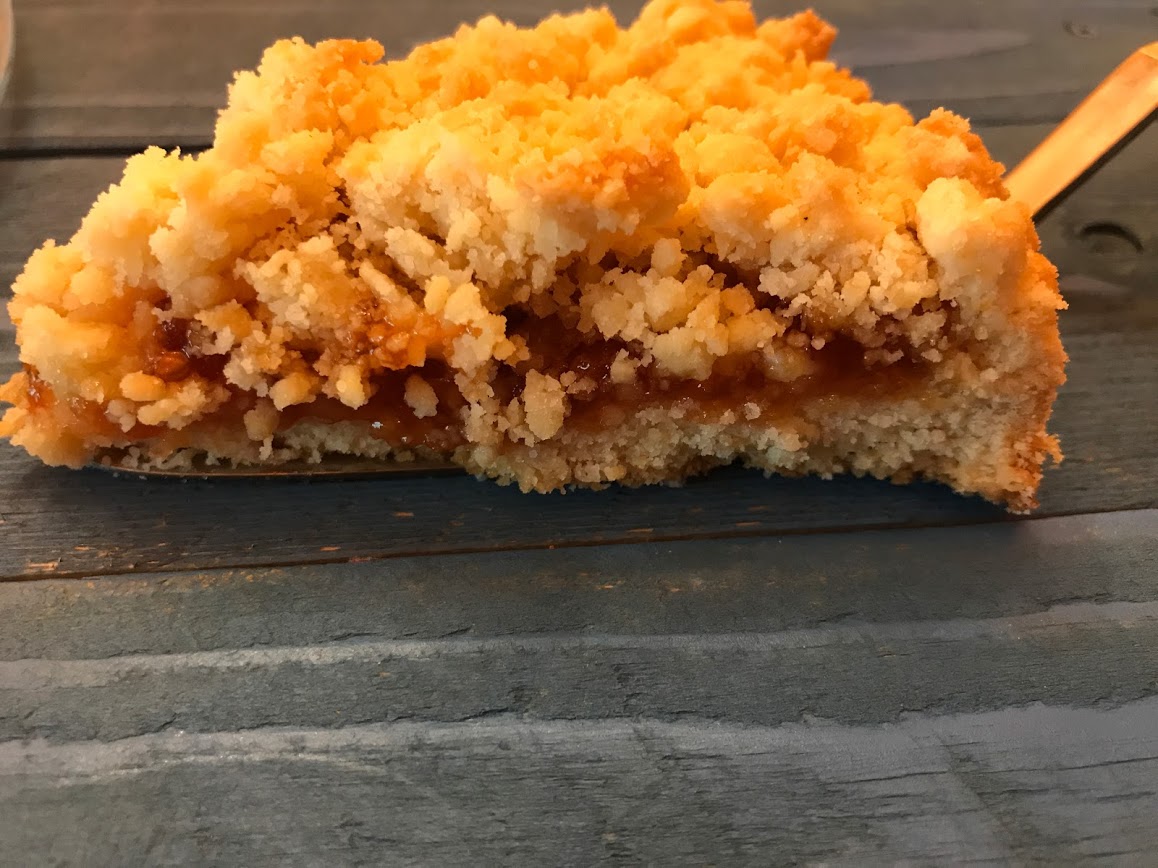 Step 5Versiamo all’interno della teglia metà del composto sbriciolato. Pressiamo leggermente la frolla con la punta delle dita, per rendere la base della sbriciolata più compatta e pronta a sostenere la marmellata una volta cotta e tagliata. Versiamo al centro la marmellata e spalmarla su tutta la superficie. |