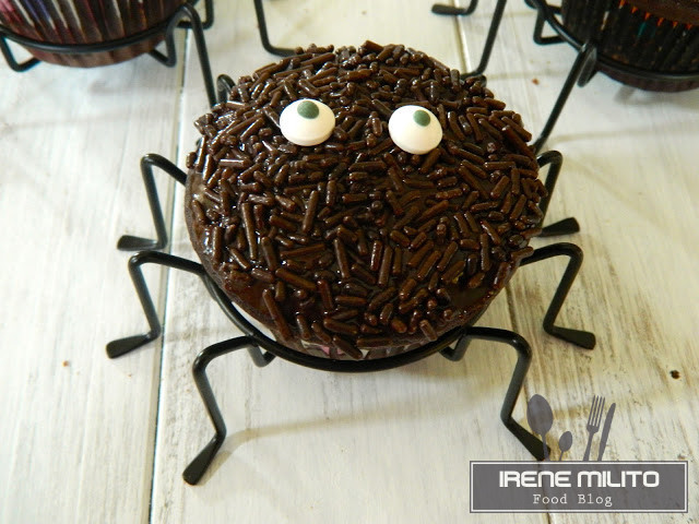 Tagliamo, poi, 8 strisce dalle girelle di liquirizia e inseriamole leggermente in modo da formare le zampe del ragnetto. Bagniamo i due confetti nel cioccolato fuso e applichiamoli sul cupcake in modo da formare gli occhi. Procediamo in questo modo per decorare i cupcake rimanenti. |
