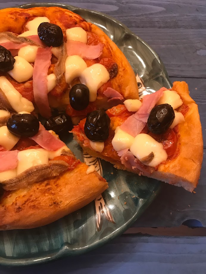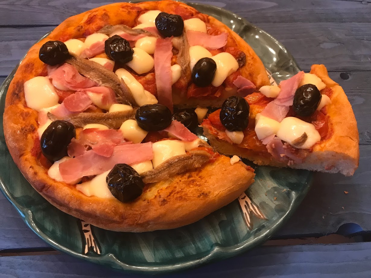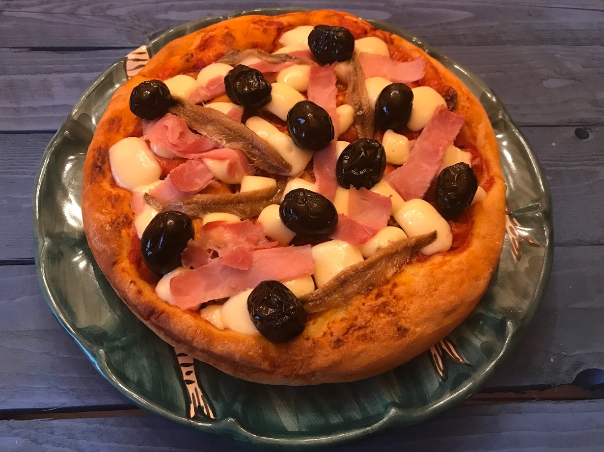 Step 3Quando la pasta della focaccia sarà lievitata possiamo iniziare a realizzare. Aiutiamoci con un matterello per dargli la forma rotonda. Quando avremo dato la forma rotonda possiamo aggiungere sopra la focaccia gli ingredienti che abbiamo scelto: i pomodorini, le acciughe sott'olio, il prosciutto cotto, la provola e le olive nere. Lasciamo cuocere in forno precedentemente preriscaldato a 200°C per una 20 di minuti. |