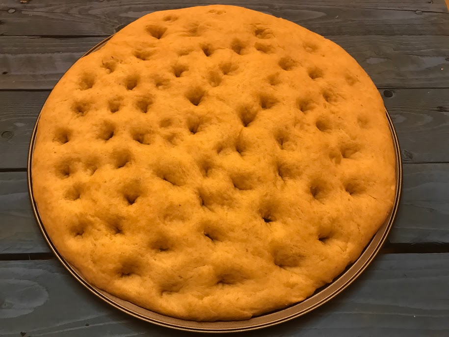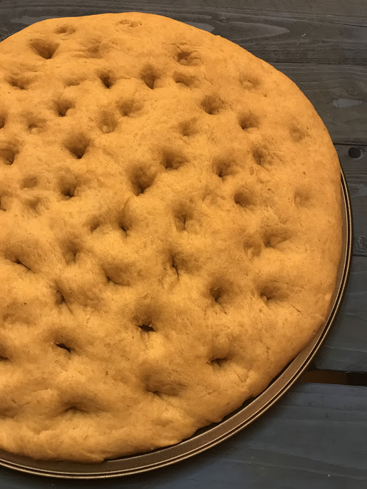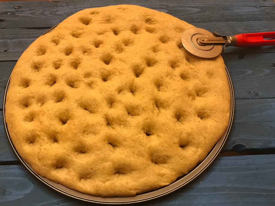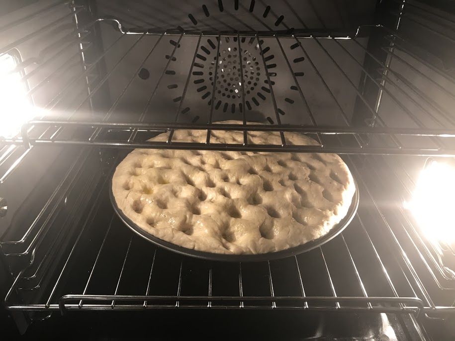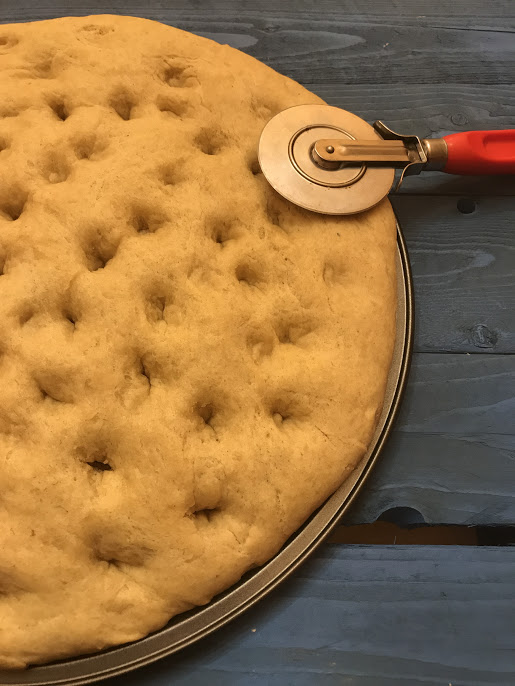 Step 4Quando la pasta della focaccia sarà lievitata possiamo iniziare a realizzare la focaccia. Aiutiamoci con un matterello per dargli la forma rotonda. Quando avremo dato la forma rotonda possiamo aggiungere sopra la focaccia una spruzzata di olio evo e se lo desiderate una manciata di origano. Lasciamo cuocere in forno precedentemente preriscaldato a 200°C per una 20 di minuti. |