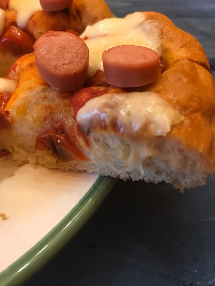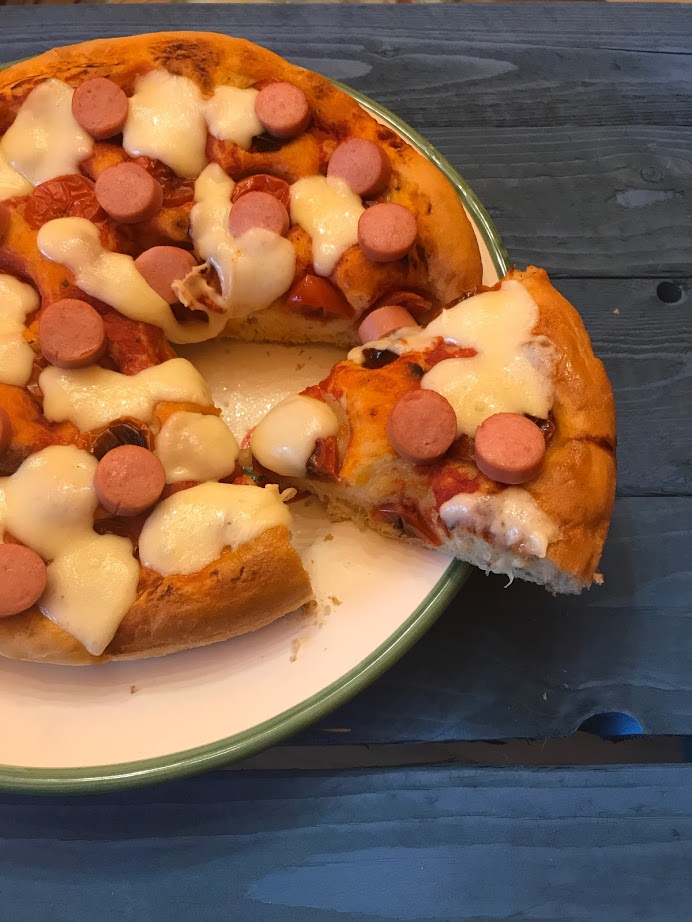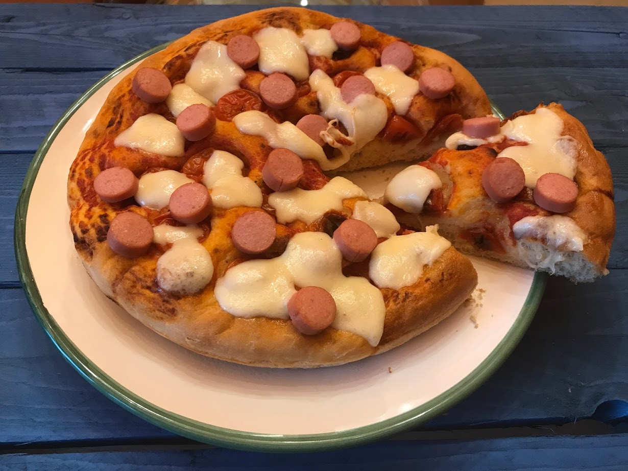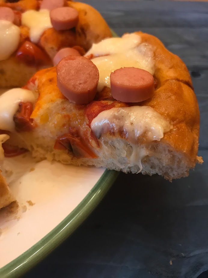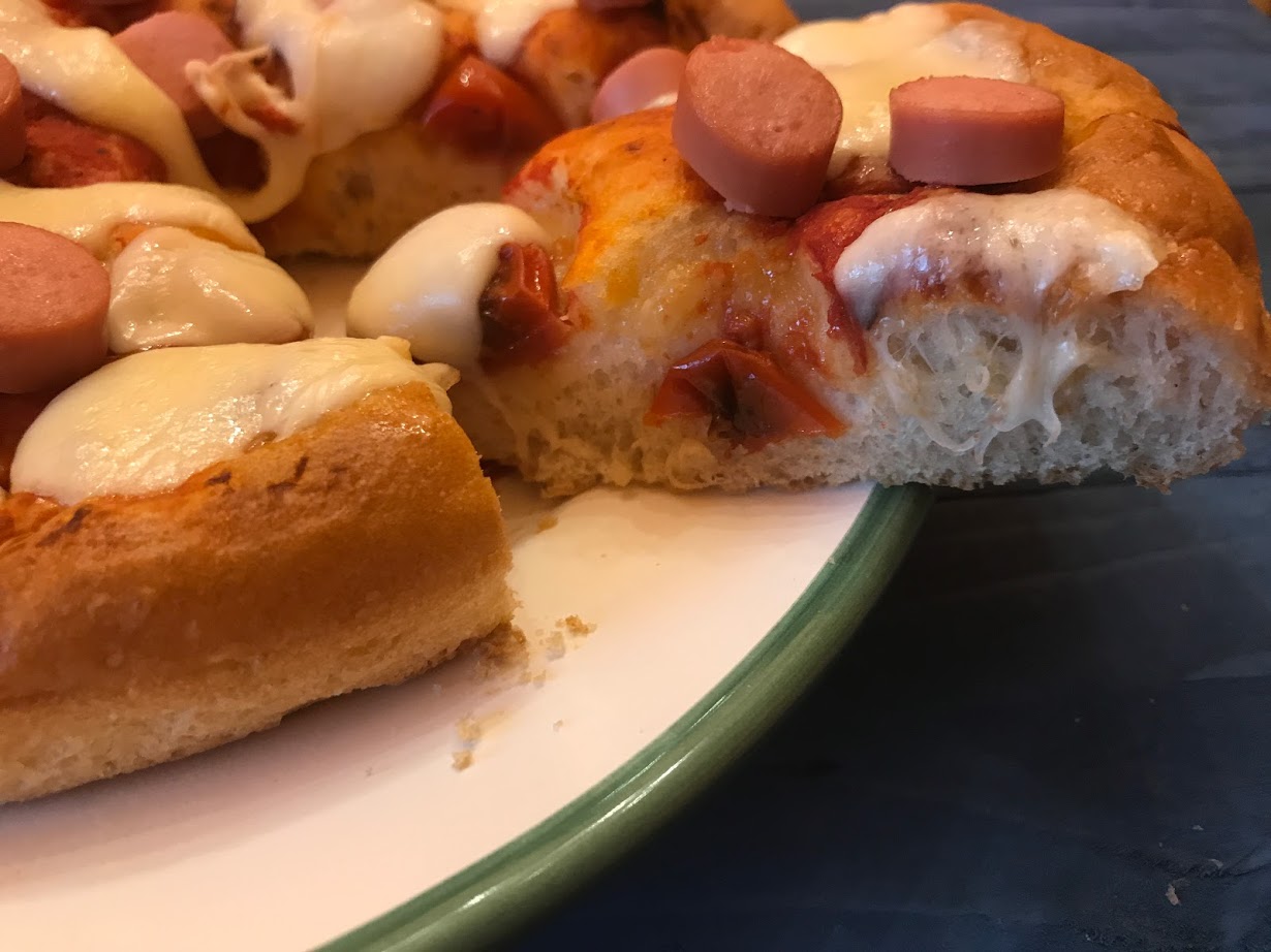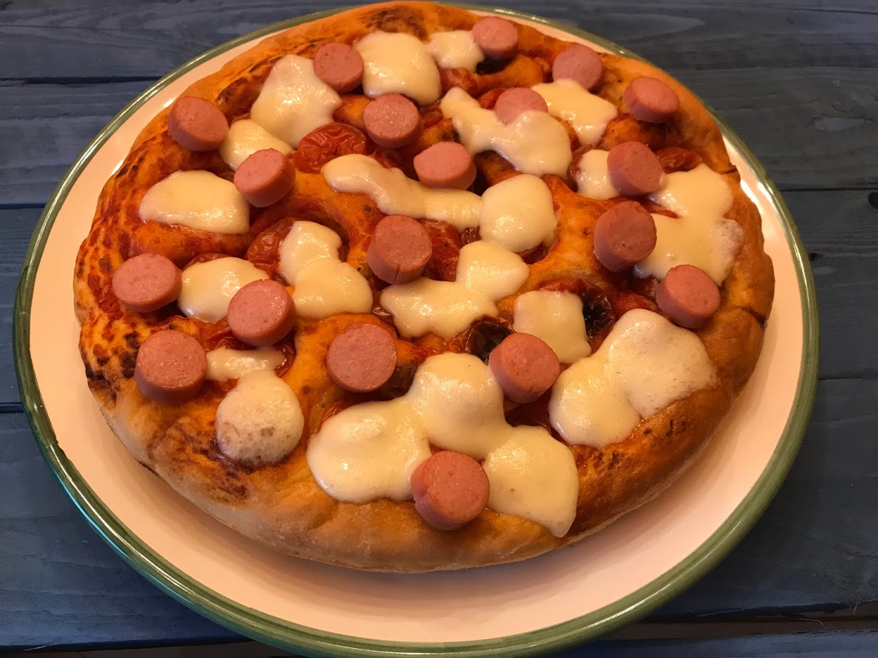 Step 3Quando la pasta della focaccia sarà lievitata possiamo iniziare a realizzare. Aiutiamoci con un matterello per dargli la forma rotonda. Quando avremo dato la forma rotonda possiamo aggiungere sopra la focaccia gli ingredienti che abbiamo scelto: i pomodorini, i würstel e la provola. Lasciamo cuocere in forno precedentemente preriscaldato a 200°C per una 20 di minuti. |
