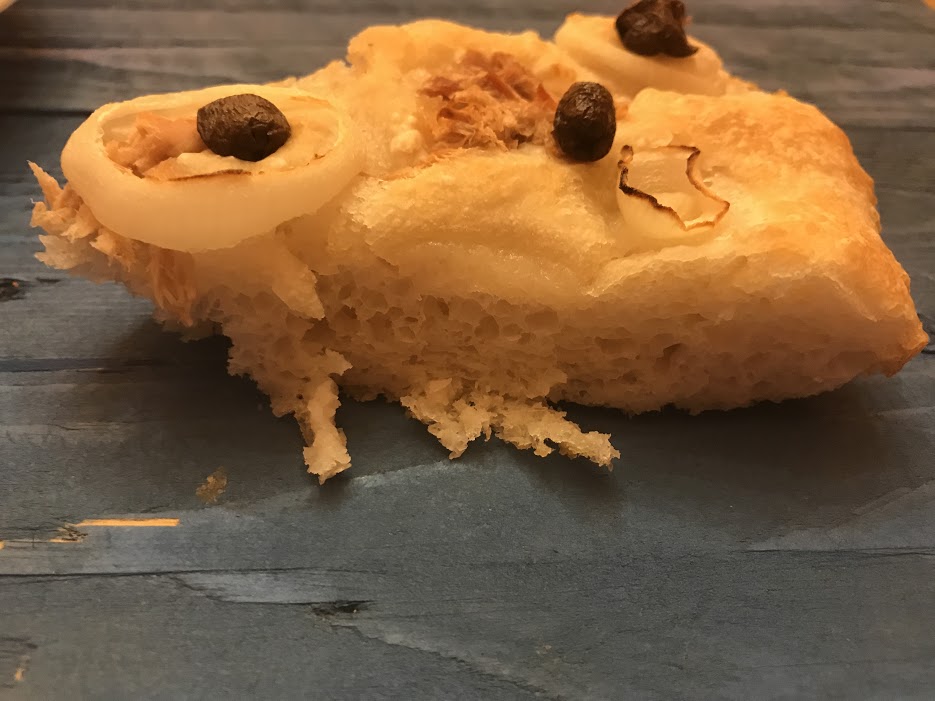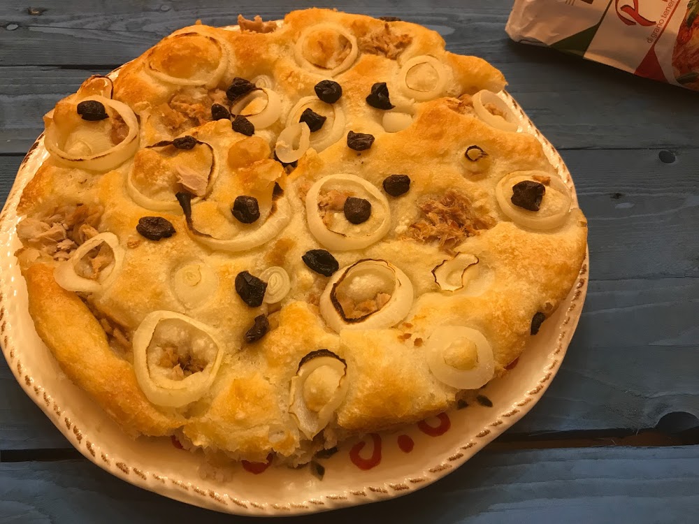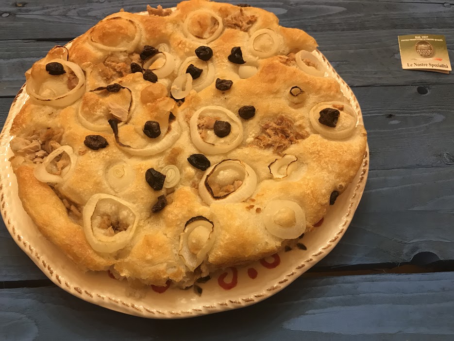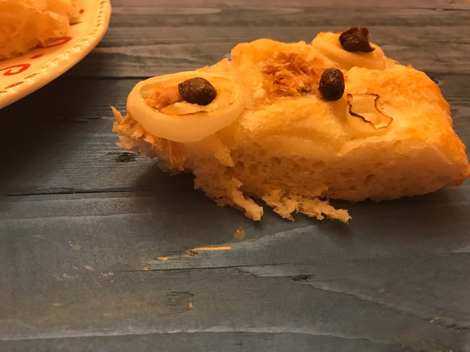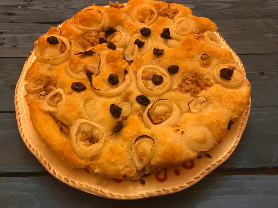 Focaccia di Nino con tonno cipolla e olive nere