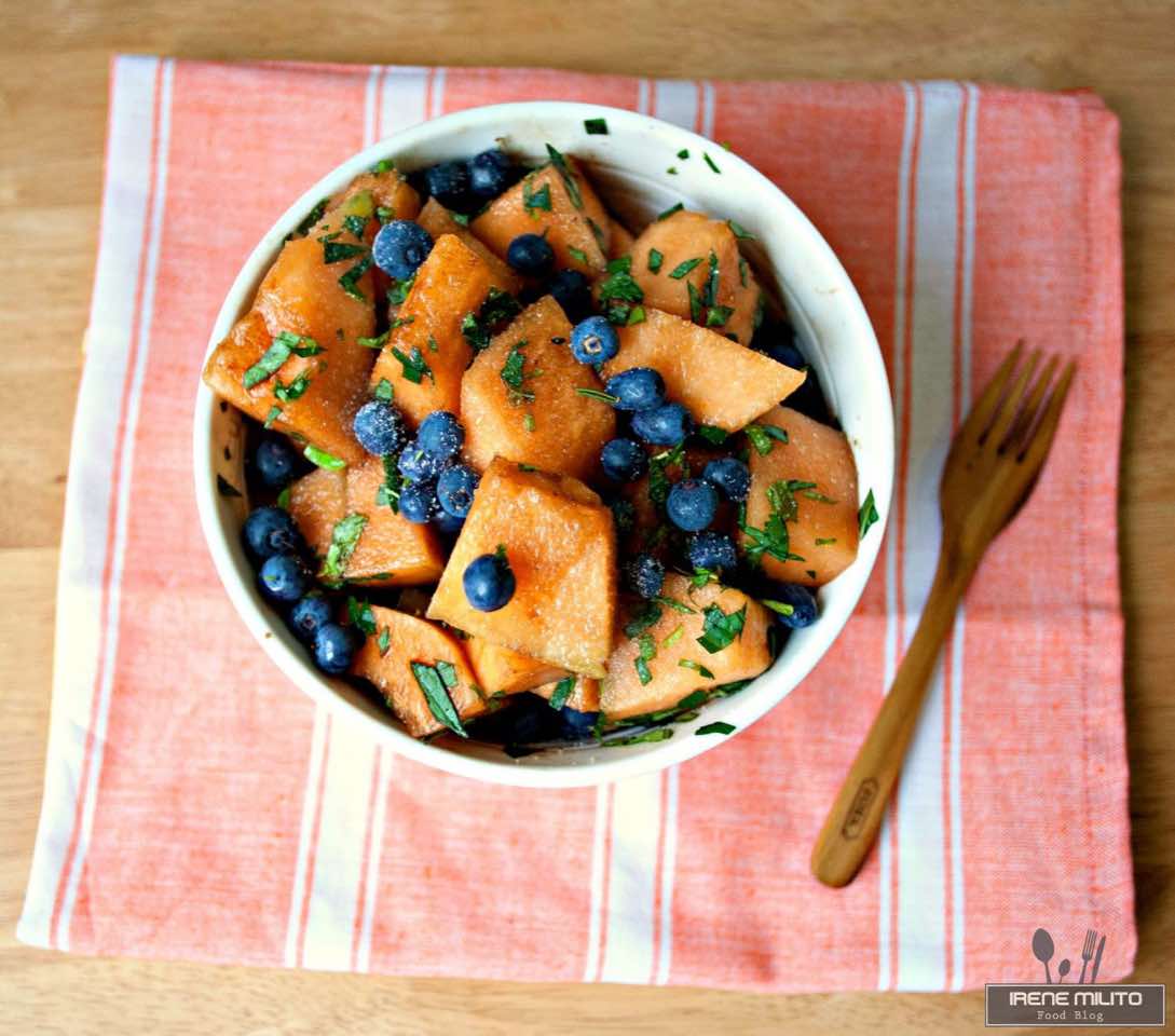 In una terrina mescolate le palline di melone con il cetriolo, la rucola e i mirtilli. Condite con pochissimo olio, un goccio di limone, poco sale e abbondante pepe macinato al momento. |