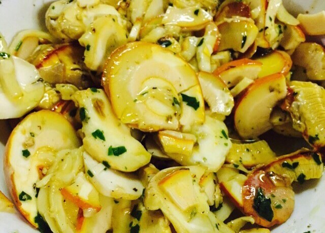 Condire con un pizzico di sale, il succo del limone e l’olio d’oliva. Ideale sarebbe metterli in frigo e lasciarceli per un 3-6 ore. |