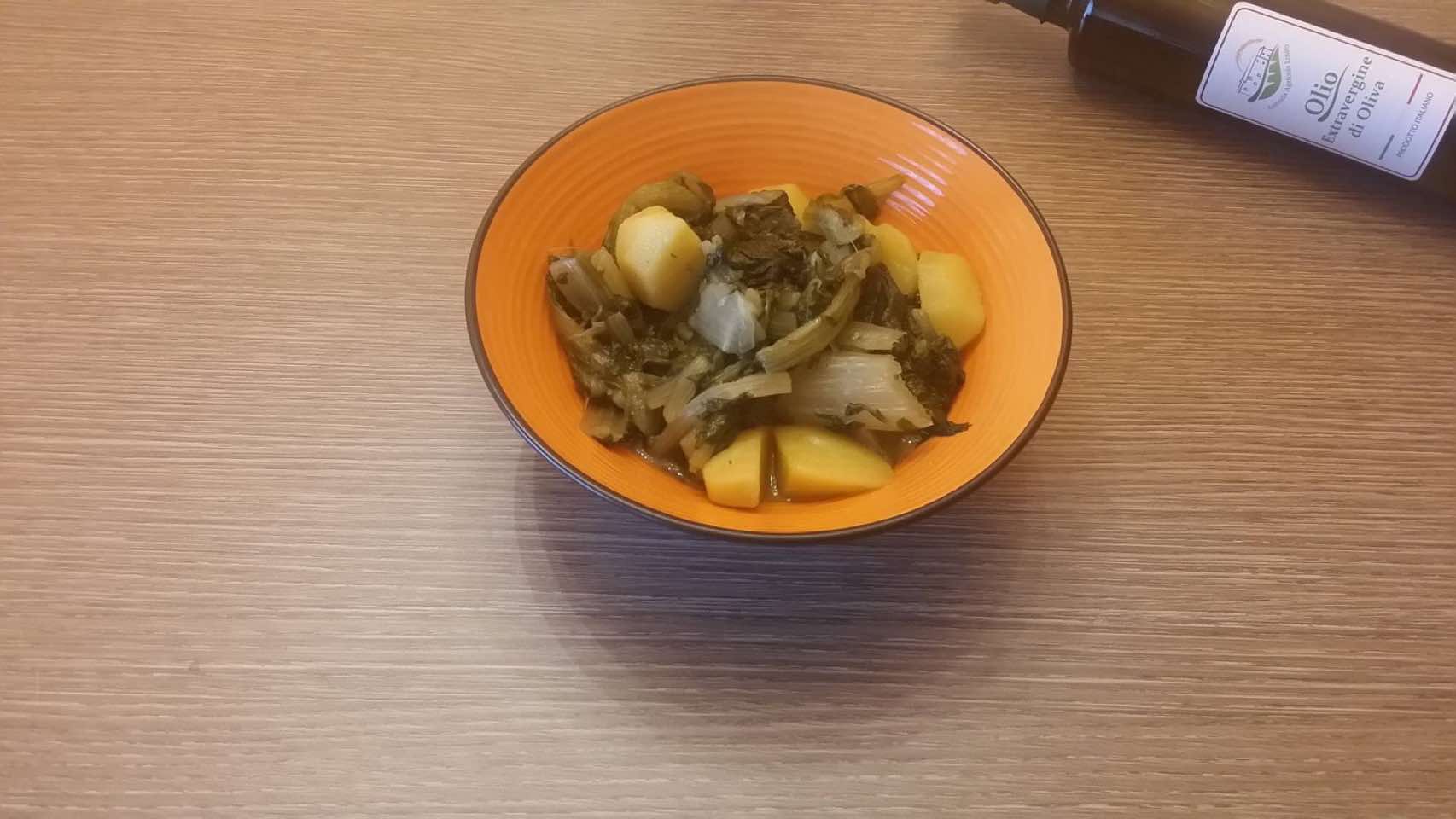 Lavate e tagliate a pezzetti le bietole e le patate; lessatele in acqua bollente salata e scolatele.