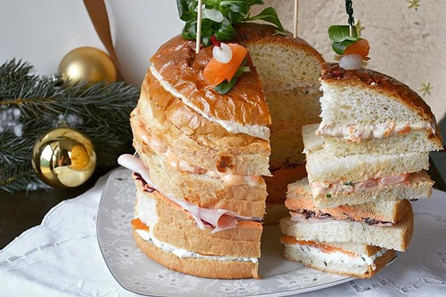 Coprite con uno strato di pane e disponetene sopra un altro, stendete la crema di burro con i sottaceti e coprite nuovamente con una fetta di pane, spalmate il burro alla vodka e distribuite le uova di lombo. Procedete ancora con pane a copertura e e nuovo strato per la farcitura di crema di formaggio con dadini di peperoni, nuova copertura di pane e nuovo strato di pane da spalmare con formaggio al salmone e aneto. Proseguite ancora con uno strato di pane e nuova fetta da spalmare con il burro alle uova sode, cospargete con i capperi ben scolati, poi un nuovo strato di crema di burro al limone e fette di prosciutto crudo. Coprite nuovamente e adagiate la calotta, premete leggermente per compattare la preparazione, avvolgetela con pellicola da cucina e lasciatela riposare in frigorifero fino al momento di servire. |