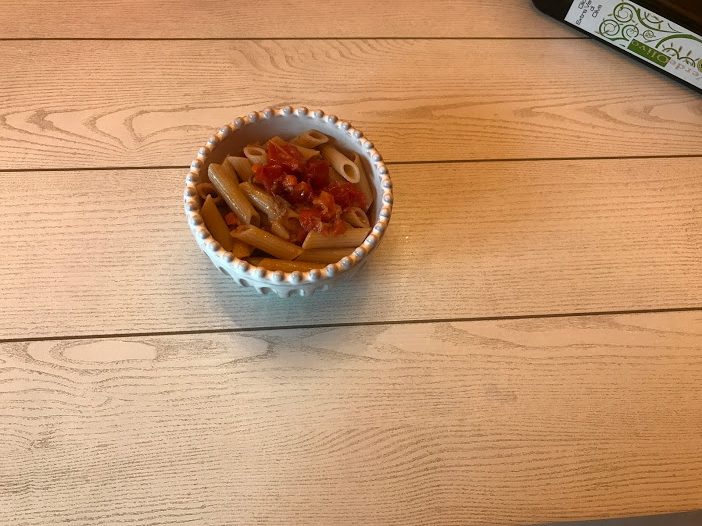 Step 3Intanto che i pomodorini si appassiscono, prendiamo una pentola con abbondante acqua salata e mettiamola sul fuoco e portiamola a bollore. Quando l'acqua della pasta bolle possiamo immergerci le nostre penne integrali con la farina di riso. La pasta deve cuocere all'incirca 7-8 minuti. |