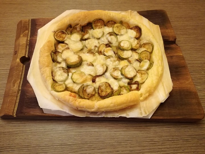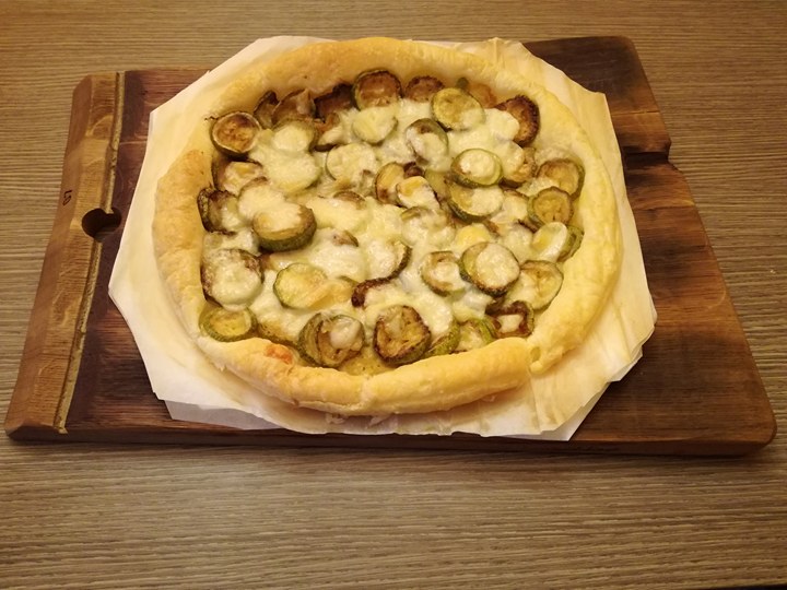 Intanto che le zucchine si intiepidiscono adagiamo il rotolo di pasta sfoglia su una teglia ricoperta da carta forno. Adagiamo le zucchine precedentemente appassite in padella e una scorpacciata di caciocavallo o formaggio filante. |