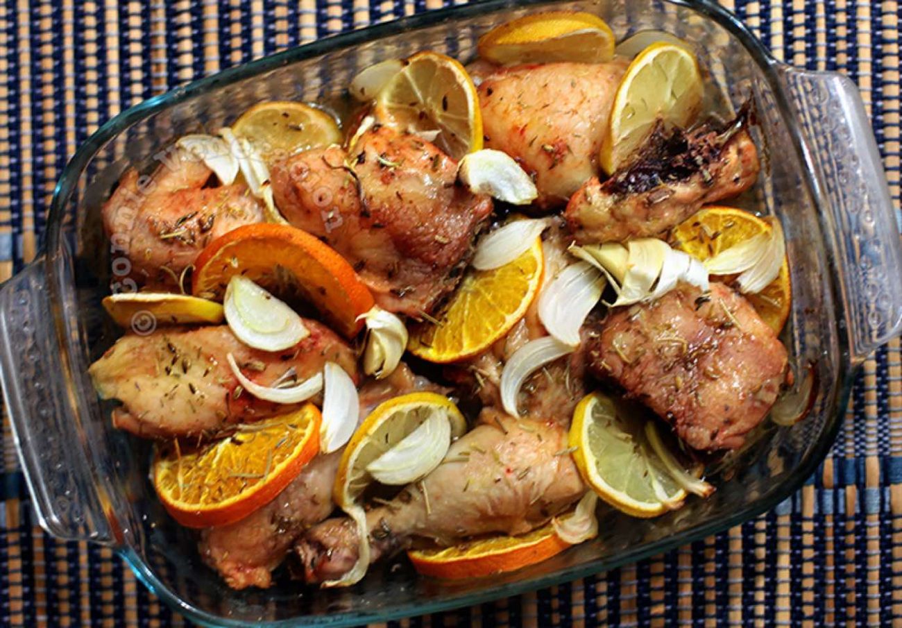 Trasferite il pollo, in una teglia con tutta la sua marinata, scartando aglio ed erbe aromatiche. Disponete nella teglia anche gli agrumi rimasti, tagliati a rondelle sottili. Condite con poco altro olio, rigirate bene e infornate a 200°C per circa un'ora, voltando di tanto in tanto i pezzi di pollo per dorarli in modo uniforme. Sfornate, completate con il prezzemolo tritato e servite subito. |