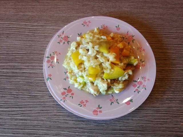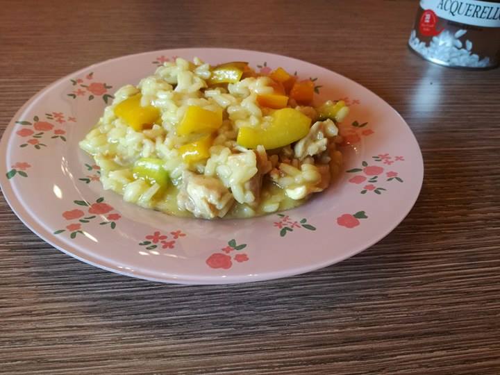 Passo 4Quando il riso è ben cotto e ben amalgamato aggiungiamo i peperoni tagliati a cubetti. A fine cottura aggiustiamo di sale e pepe. Serviamo in ciotole e se preferiamo guarniamo con la valeriana e alcune fettine di limone. |