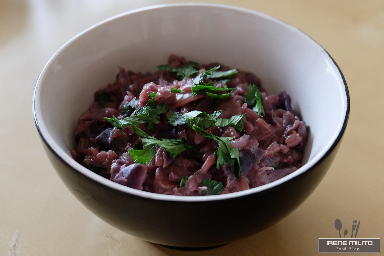 Lavate il basilico e tenetelo da parte. Eliminate la costa centrale del cavolo, lavatelo e spezzettatelo. Tostate il riso in una padella con l'olio, quando risulta translucido sfumate con il vino bianco. Abbassate il fuoco, aggiungete cipolla e scalogno finemente tritati, il cavolo rosso a tocchetti e 500 ml di brodo vegetale caldo. |