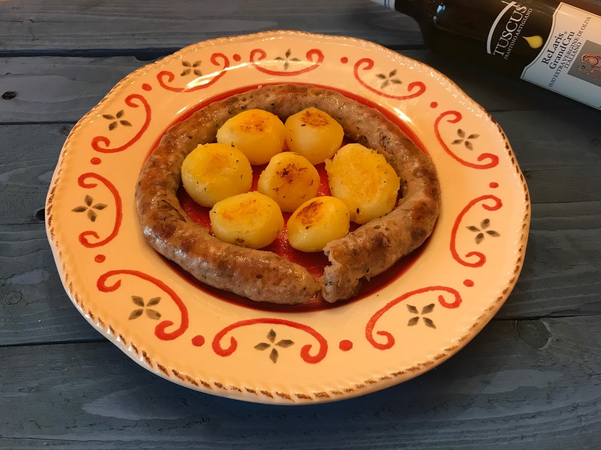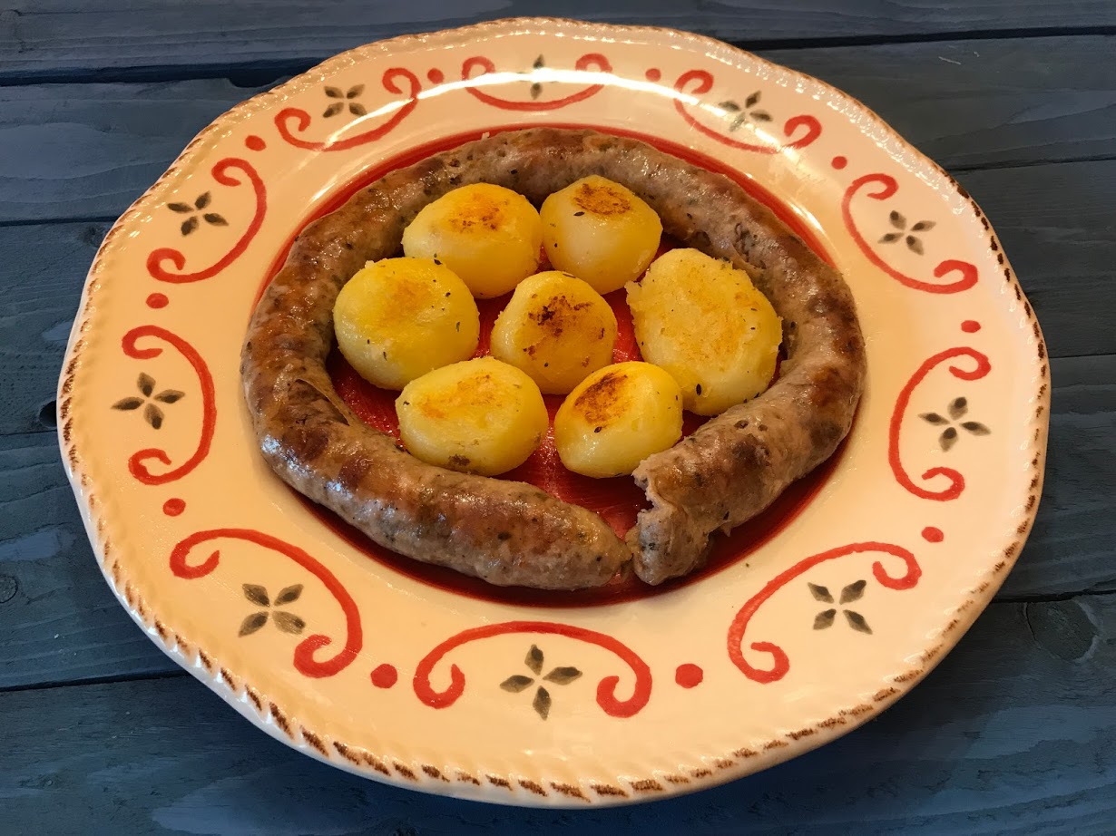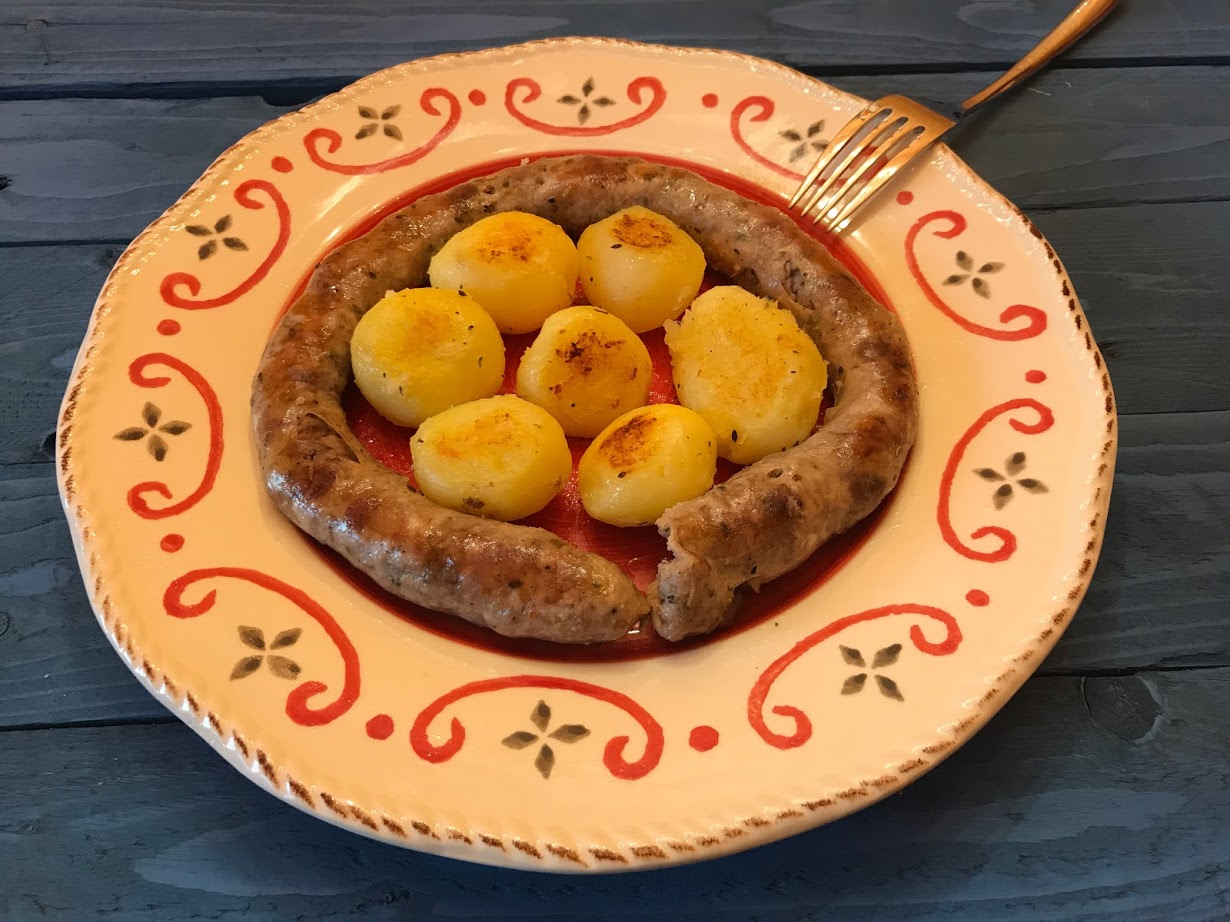 Step 3Quando tutti gli ingredienti saranno dorati possiamo togliere la salsiccia con le patate dal forno e adagiarla su un piatto da portata. Servirla ben calda. |