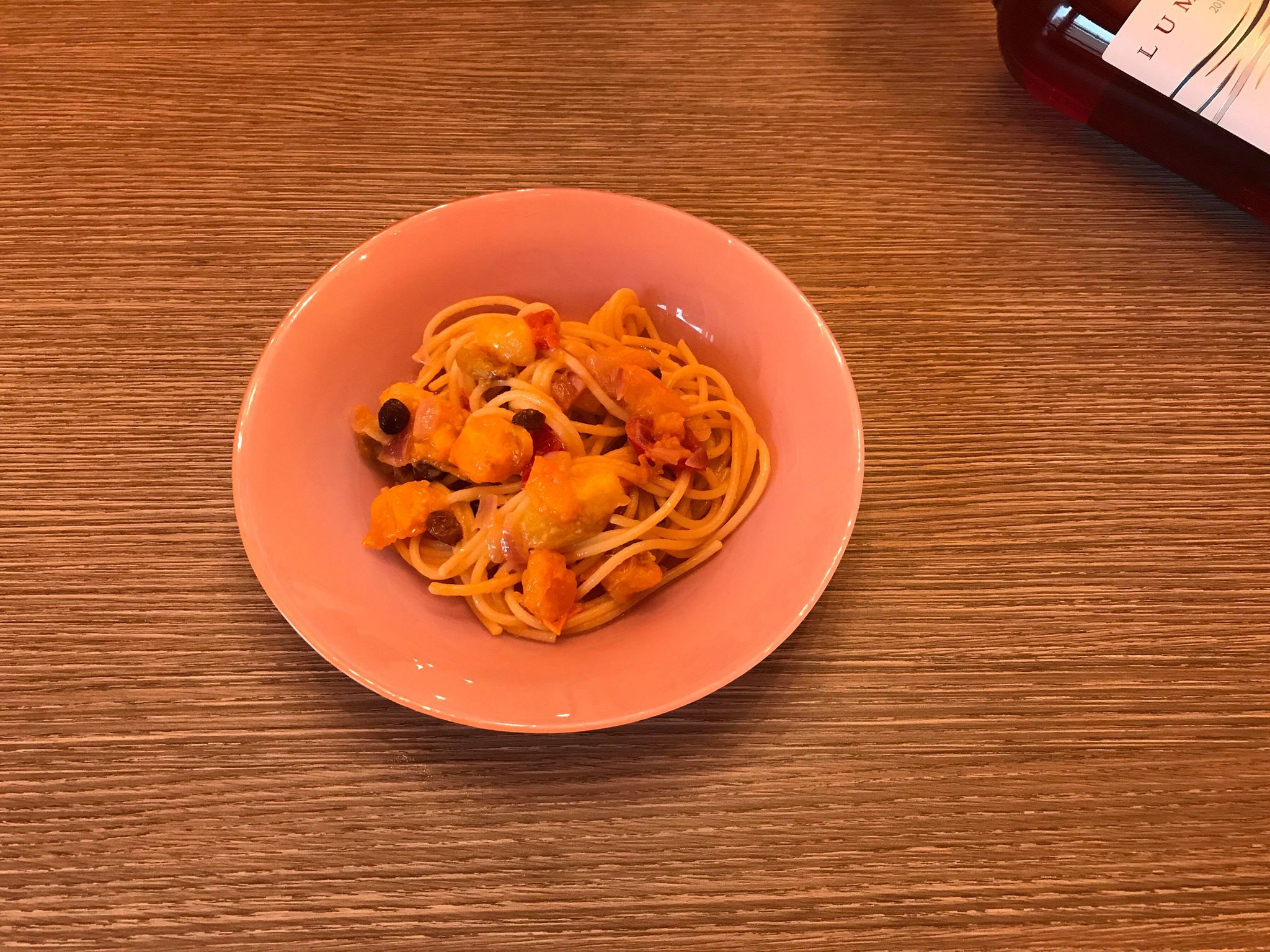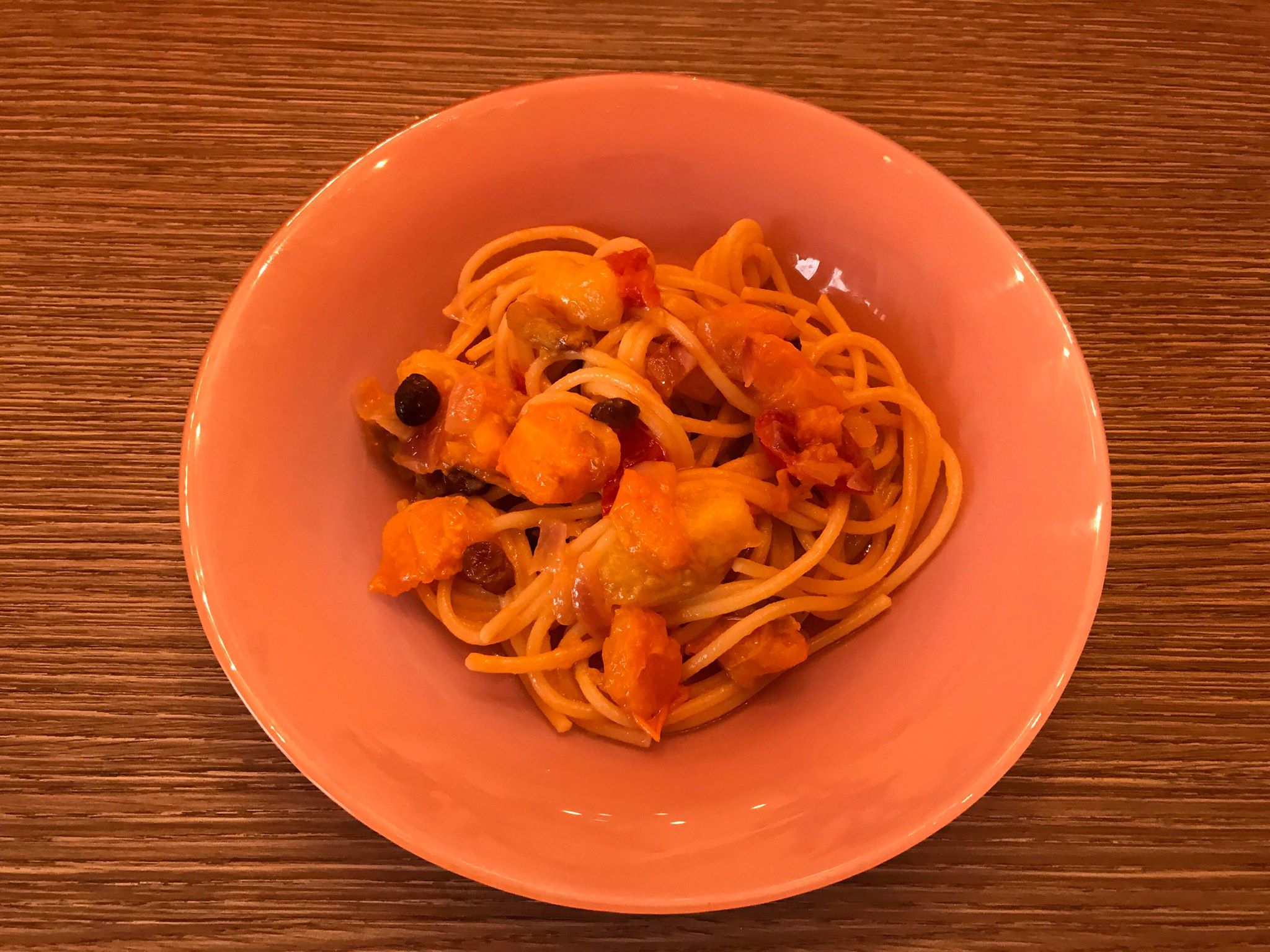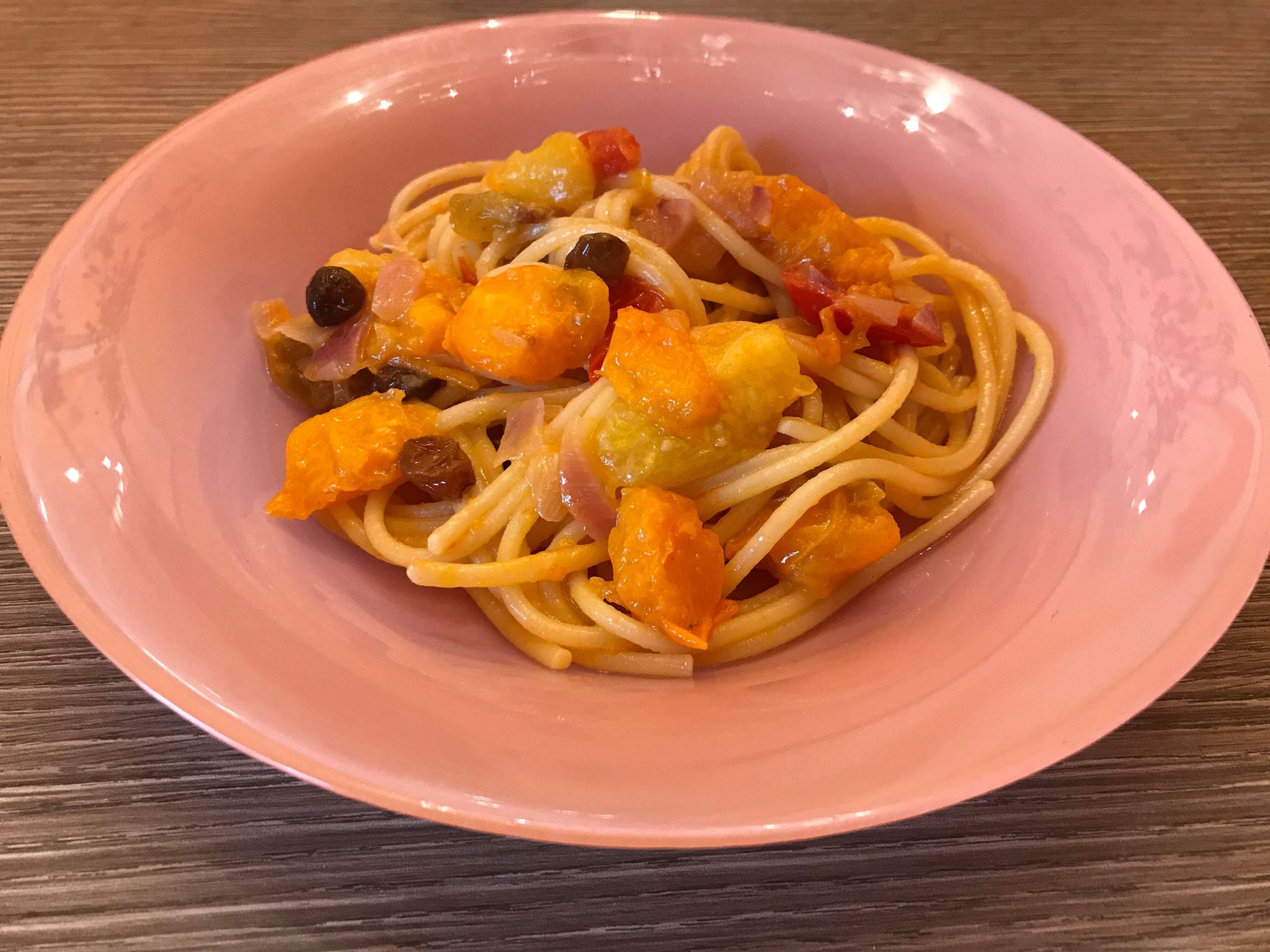 Step 3Quando gli spaghetti saranno cotti possiamo scolarli e immergerli nel sugo dei pomodorini. Mescoliamo il tutto e aggiungiamo l'uva passita. Servite ben caldi. |