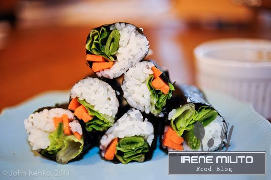 Spalmate un velo di patte di olive o di soianese a seconda dei vostri gusti e adagiate nel mezzo le strisce di carote e di avocado. Arrotolate l'alga aiutandovi con la stuoia di bambù. Tagliate il sushi in cilindri regolari e servite. |
