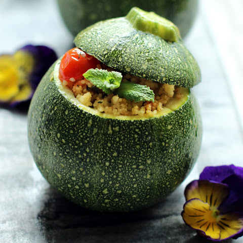 Aggiungete la feta e le zeste di limone al cuscus, e mescolate ancora. Riempite le 4 zucchine con il cuscus e portatele in tavola, decorando ognuna con la propria calotta. |