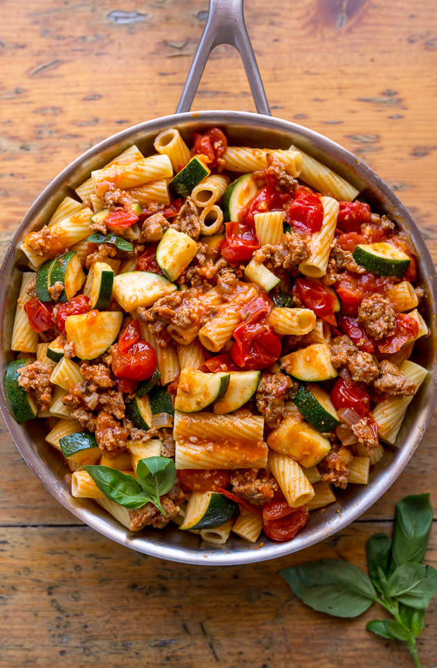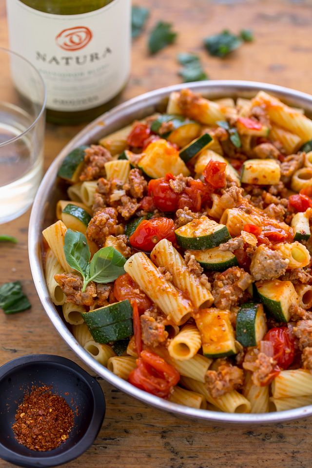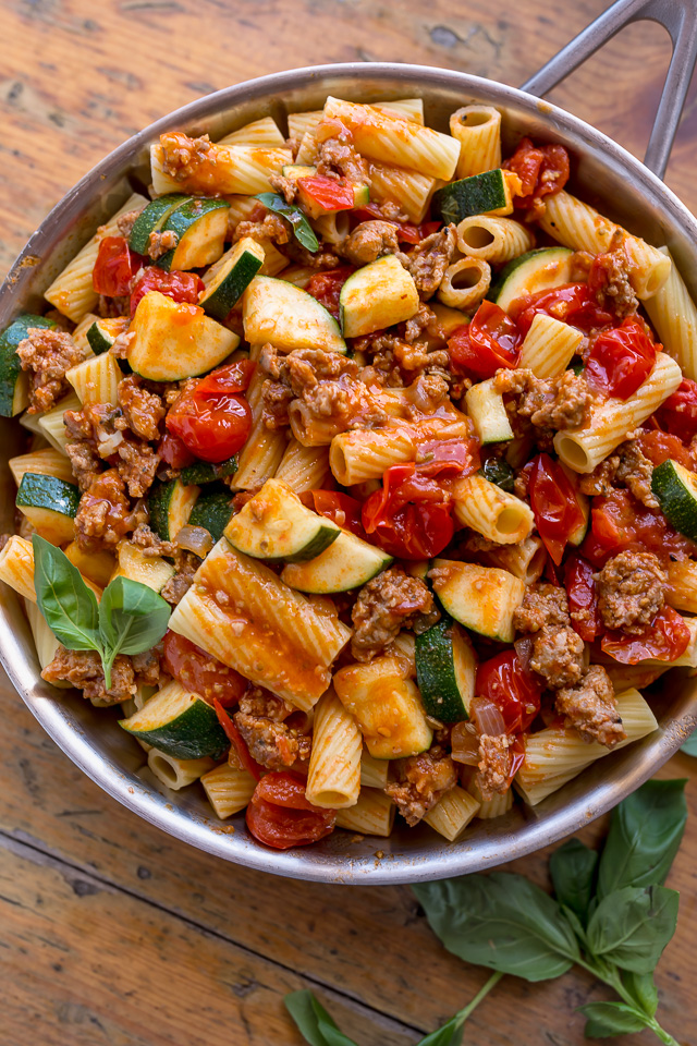 A proposito di pasta, permettetemi di presentarvi la nuovissima ricetta di oggi: rigatoni salsiccia, pomodori e zucchine! È total comfort food e il piatto di pasta perfetto per quelle serate in cui vuoi qualcosa di qualità da ristorante senza uscire di casa! Mi sto godendo gli avanzi per pranzo questa settimana e sarò così delusa quando finalmente finirò! La base è una salsa di pomodoro fresco che viene caricata con salsiccia e zucchine. Ma non è una salsa marinara! Invece è composto da 2 pinte di pomodorini succosi, vino bianco (o brodo di pollo) e un po’ di concentrato di pomodoro. È un po ‘più leggero della tipica salsa rossa – e MOLTO più leggero dei miei sostanziosi rigatoni al forno con carne di manzo! – rendendolo perfetto per l’estate! Perfetto anche per intingere un pezzo di pane all’aglio o qualche nodo d’aglio. NOME.