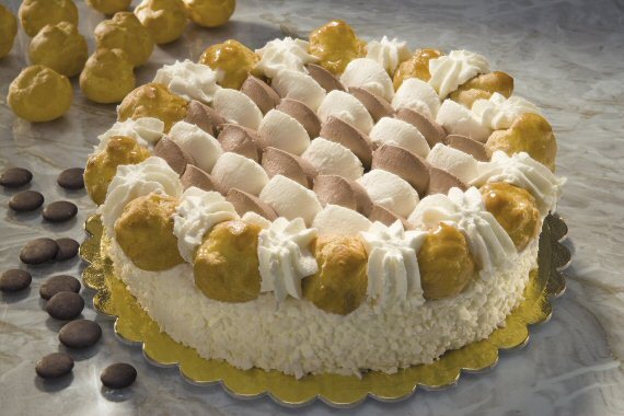 Stendete la pasta sfoglia a circa 2 mm di spessore, bucherellatela e ricavate un disco di 20 cm di diametro. Trasferitelo su una teglia, rivestita con carta forno, spennellatelo con un goccio acqua e formate intorno un cordone con la pasta per bignè. Con la pasta rimanente fate dei piccoli bignè, infornate tutto a 180°C e fate cuocere per circa 30 minuti. Sfornate e fate raffreddare. Per la crema: portate a bollore il latte con la panna, nel frattempo lavorate i tuorli con 120 gr di zucchero, l’amido di mais e la vaniglia. Unite il composto di uova al latte caldo, mettete sul fuoco e fate cuocere, fino a quando la crema si sarà addensata. Spegnete e unite la colla di pesce, ammollata in acqua e poi strizzata. Coprite con pellicola trasparente e tenete da parte. Fate sciogliere 180 gr di zucchero e 50 ml di acqua (fino a 120°C) e versate a filo gli albumi montati a neve. Lavorate con le fruste elettriche fino a raffreddamento, quindi unite alla crema calda, mescolando delicatamente. Farcite i bignè con la crema ottenuta, tenendone da parte almeno 1/3. Trasferite il disco di pasta sfoglia su un piatto da portata. Per la finitura: versate in un pentolino lo zucchero con 2 cucchiai di acqua e fate caramellare. Immergete rapidamente i bignè nel caramello e disponeteli man mano sul bordo. Spalmate uno strato di crema sul disco di sfoglia e adagiatevi sopra un disco di pan di Spagna, inzuppato di bagna al rum. Guarnite la superficie con file alternate di crema bianca e al cioccolato. Conservate in frigorifero, fino al momento di servire.
