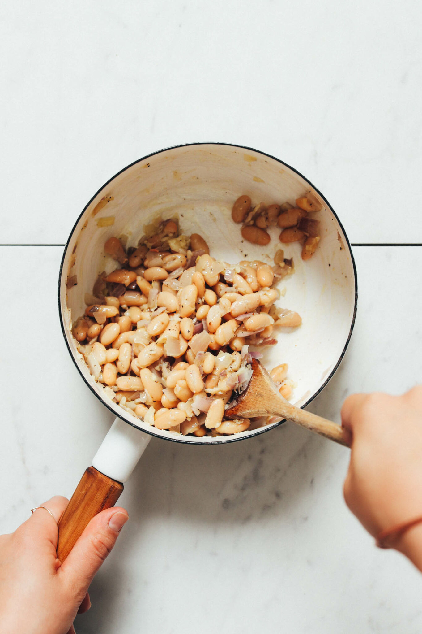 - In una casseruola media a fuoco medio, scaldare 2 cucchiai (30 ml // aggiustare se si modifica il numero di porzioni) di olio d’oliva. Una volta caldo, aggiungere l’aglio e lo scalogno, rosolare finché non si ammorbidiscono e diventano traslucidi – circa 3 minuti. Abbassare il fuoco a medio-basso e aggiungere i fagioli cannellini, sale e pepe. Mescolare bene per unire e scaldare per 3-5 minuti o fino a quando i fagioli non si saranno scaldati.