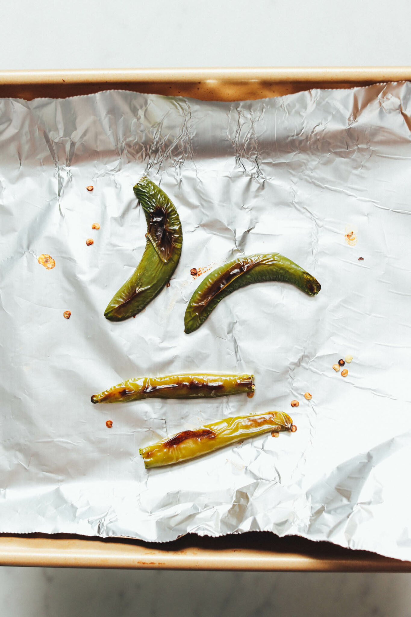 Inizia con grigliare dei peperoni serrano in forno, dando loro un bel sapore affumicato e attenuando parte dell’intensa piccantezza dei peperoni freschi. Metterli su un foglio di alluminio impedisce che si attacchino alla padella e si avvolgono anche intorno ai peperoni dopo la tostatura, il che (consiglio professionale!) Li rende molto più facili da sbucciare!