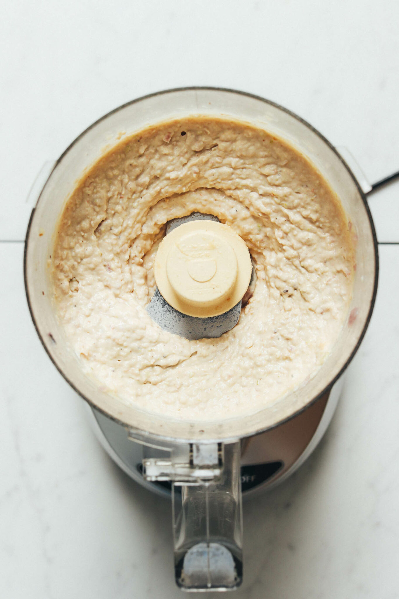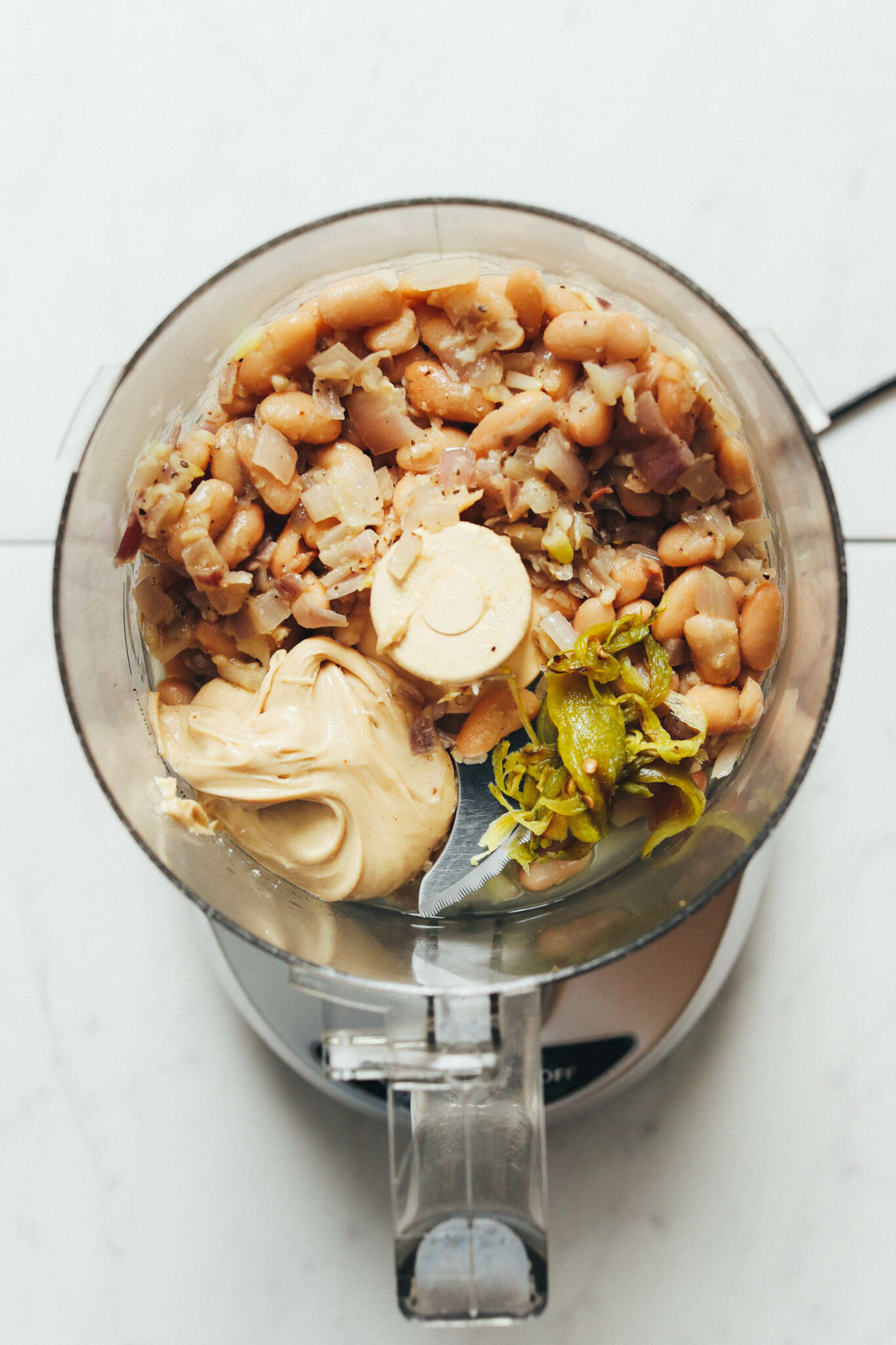 - In un robot da cucina, aggiungi la miscela di fagioli, i peperoni carbonizzati, il burro di anacardi e il succo di limone. Frullare per circa 1 minuto, raschiando i lati secondo necessità. Quindi, con il robot in funzione, versare con cura i restanti 3 cucchiai (45 ml // regolare se si modifica la dimensione della quantità) di olio d’oliva fino a ottenere un composto cremoso e liscio.