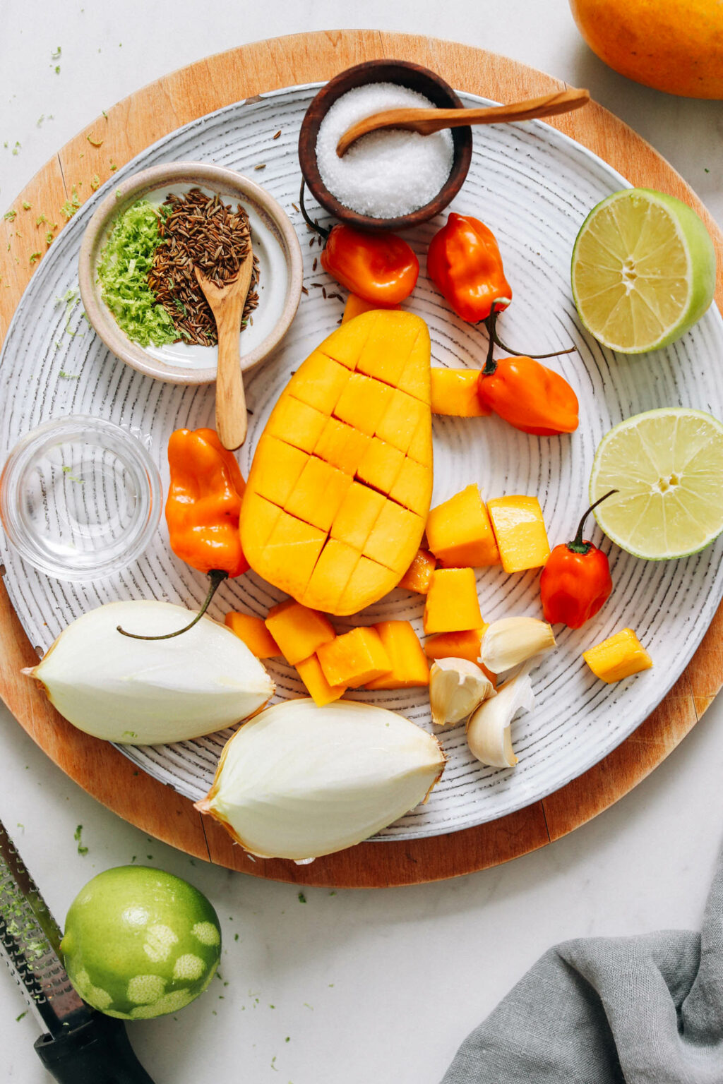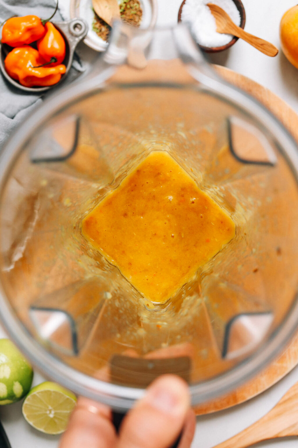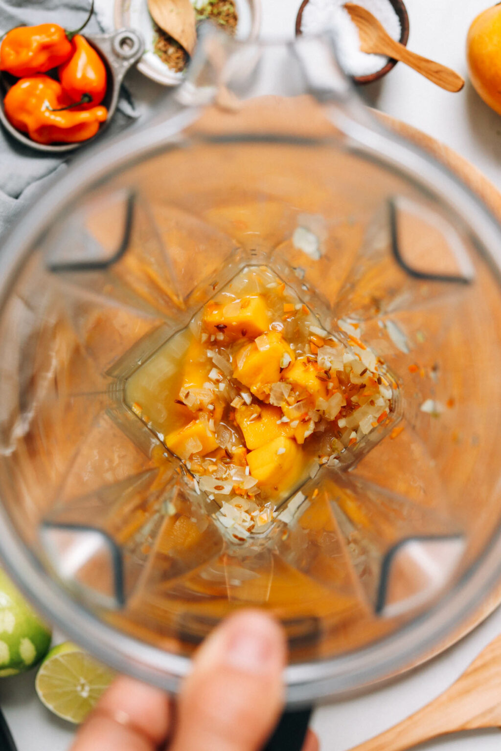 Una volta tolto di mezzo il peperoncino, siamo pronti per il resto degli ingredienti: succo e scorza di lime, mango dolce per bilanciare il calore, sale e aceto per le classiche salse piccanti e acqua per farlo amalgamare.