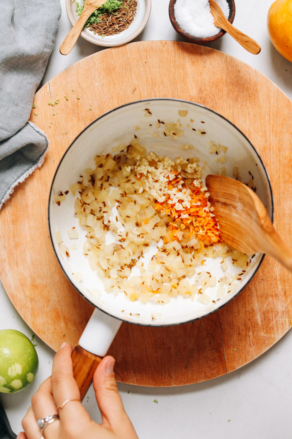 - In una piccola casseruola a fuoco medio, aggiungere acqua, cipolla e semi di cumino. Soffriggere per 4-5 minuti coperto, mescolando di tanto in tanto per evitare che si attacchi. Abbassare la fiamma e/o aggiungere un po’ d’acqua se si scurisce troppo velocemente.