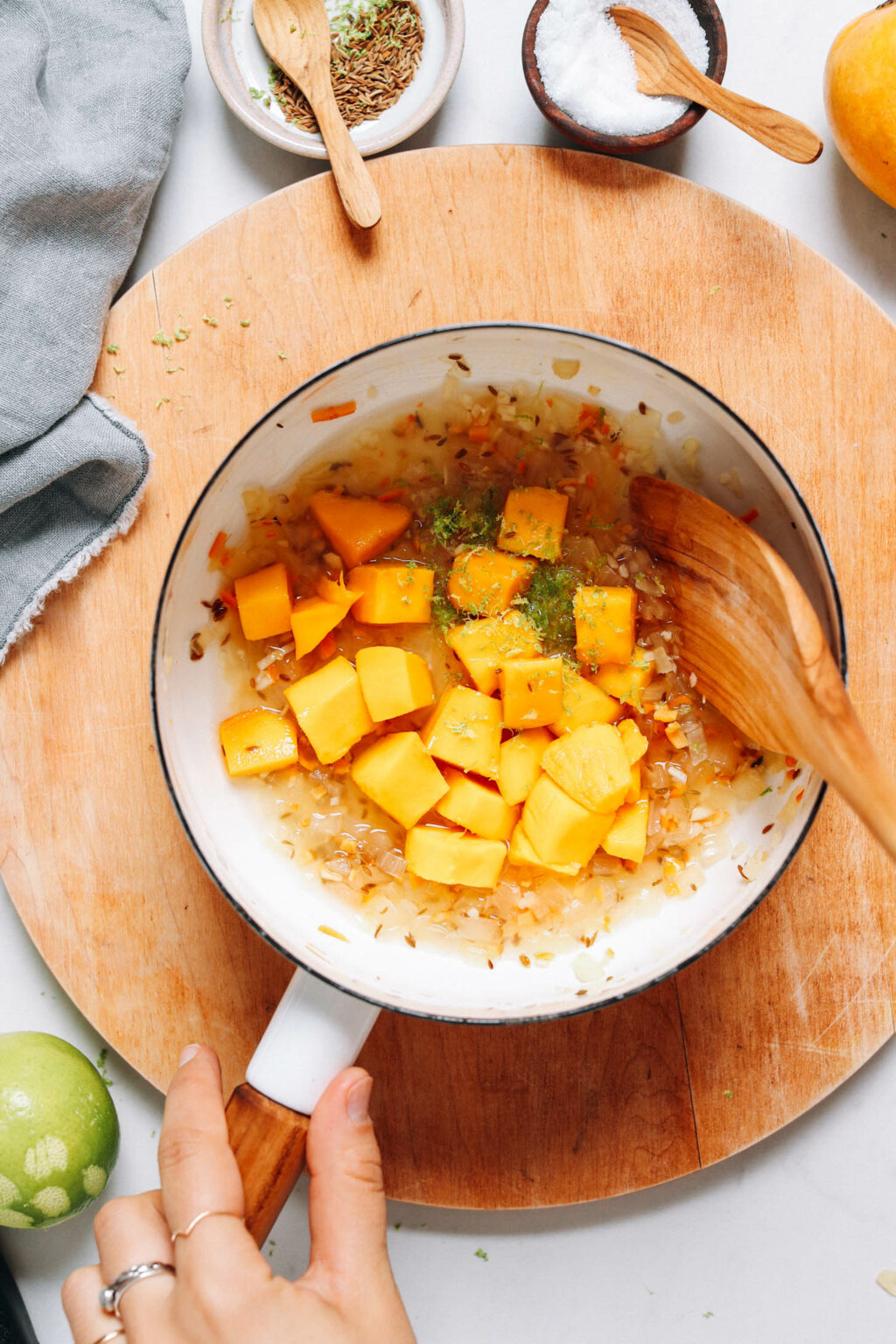 - Aggiungere il mango, la scorza di lime e il succo di lime (a partire dalla quantità minore), l’aceto (a partire dalla quantità minore) e l’acqua (a partire dalla quantità minore) e cuocere a fuoco lento coperto per altri 3-4 minuti.