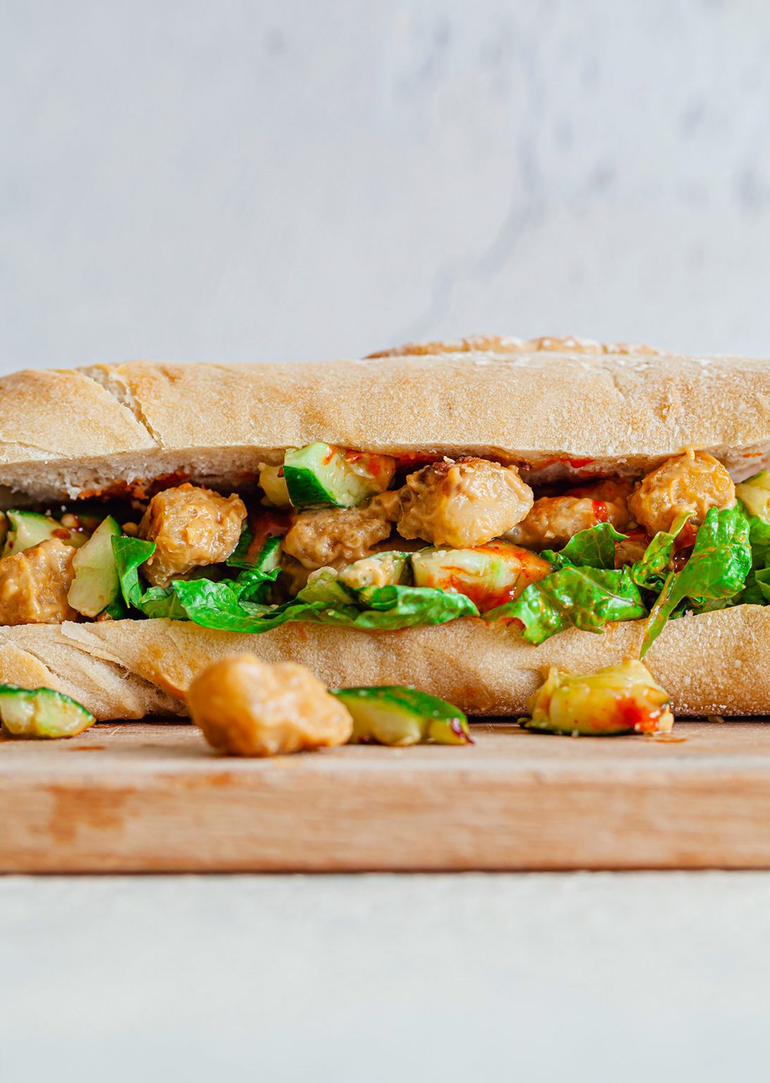 Pezzi di tofu croccanti conditi in una splendida salsa satay e a strati in una baguette con cetriolo schiacciato. Chi ha detto che i panini sono noiosi?