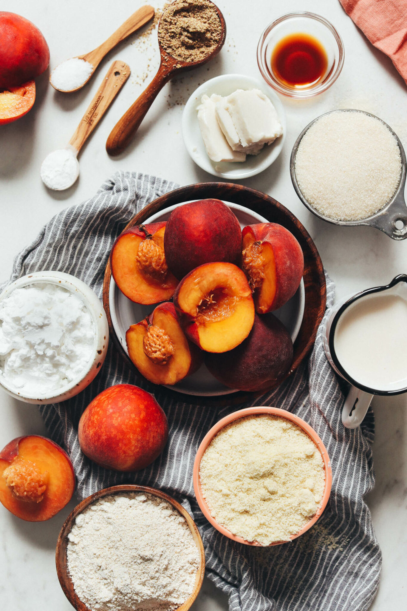 Gli ingredienti rimanenti includono latte senza latticini e uova di lino per la struttura, un po’ di zucchero di canna per la dolcezza e sale e vaniglia per un sapore extra. Oh, e non dimenticare le PESCHE!