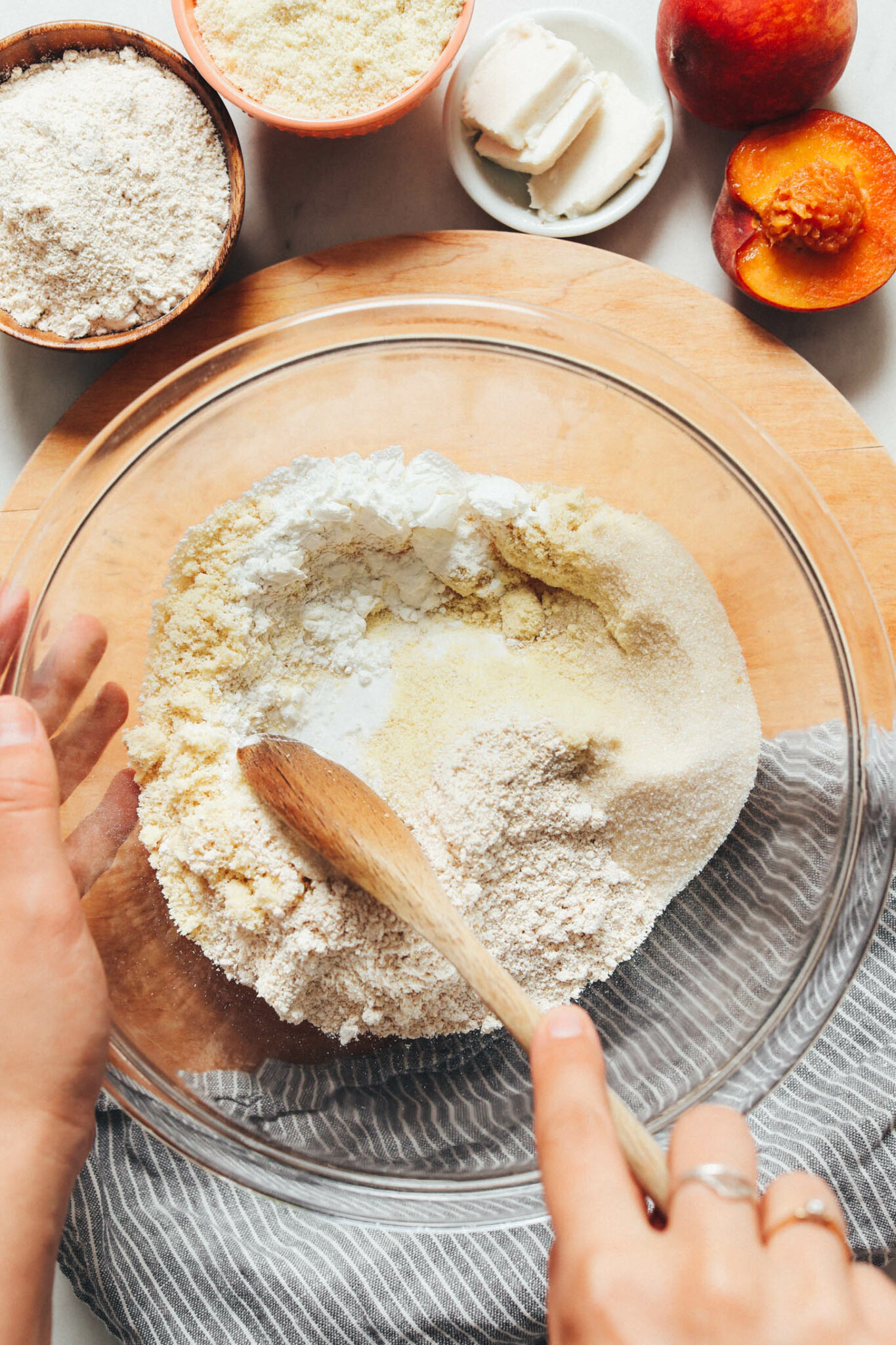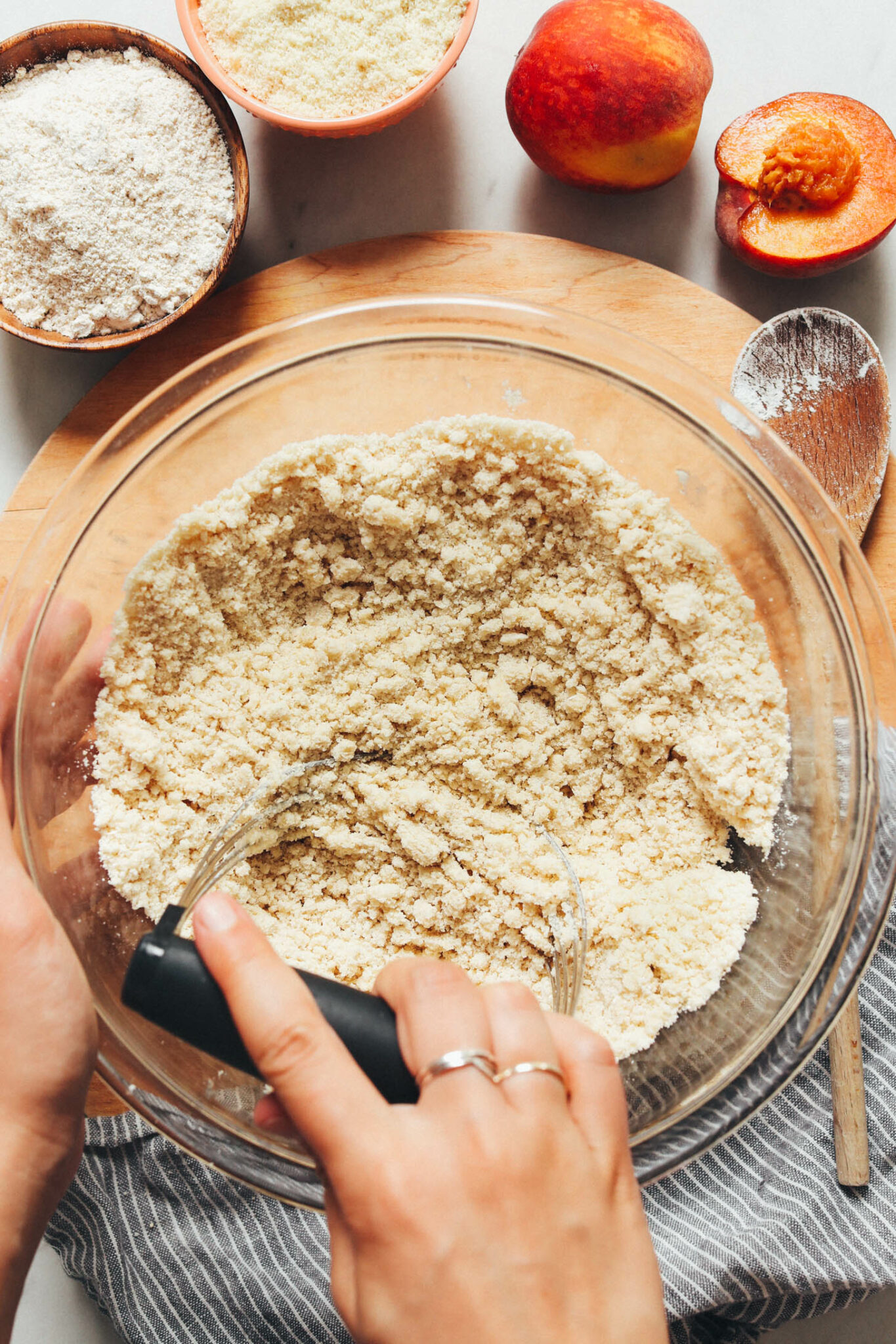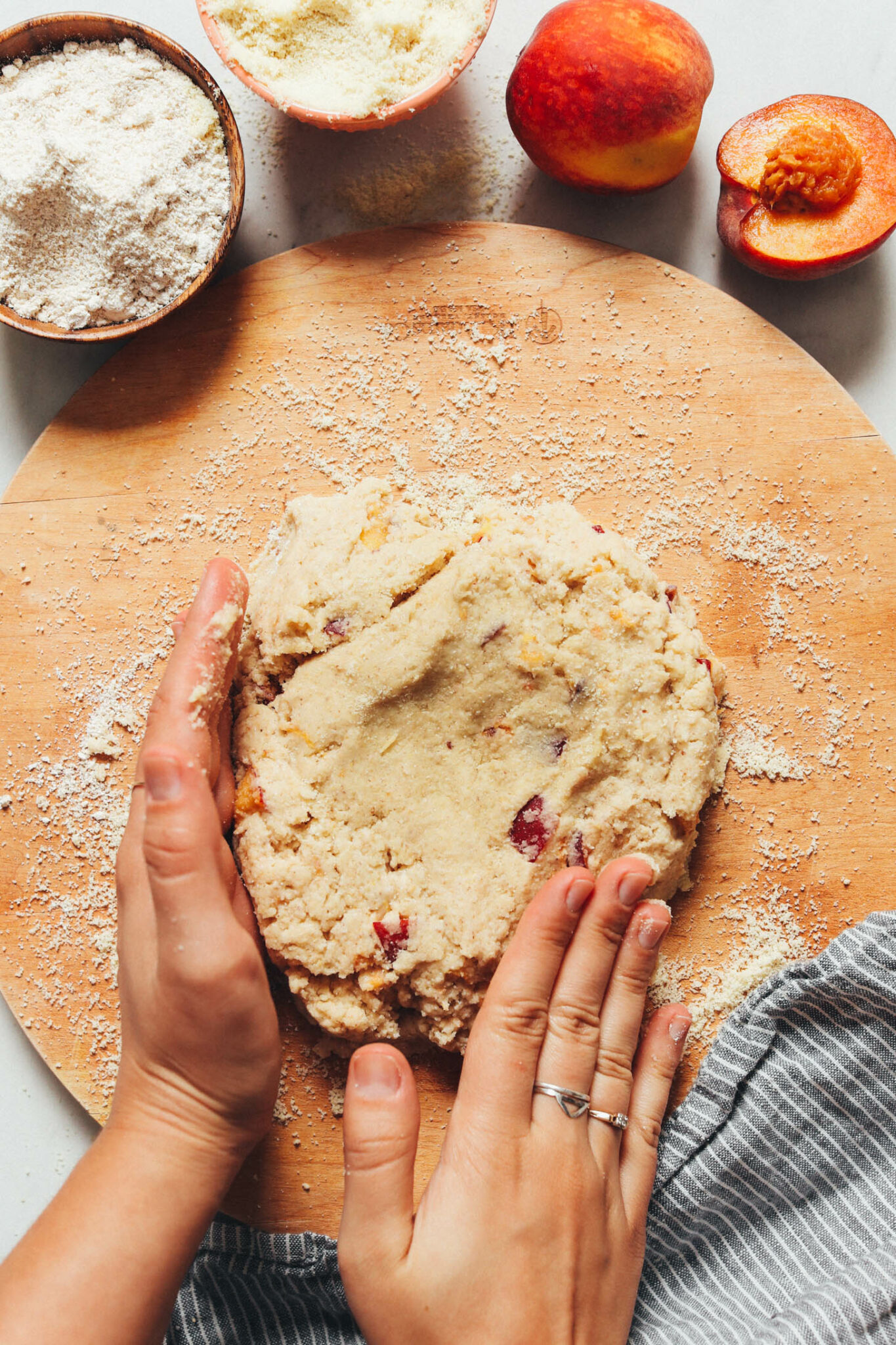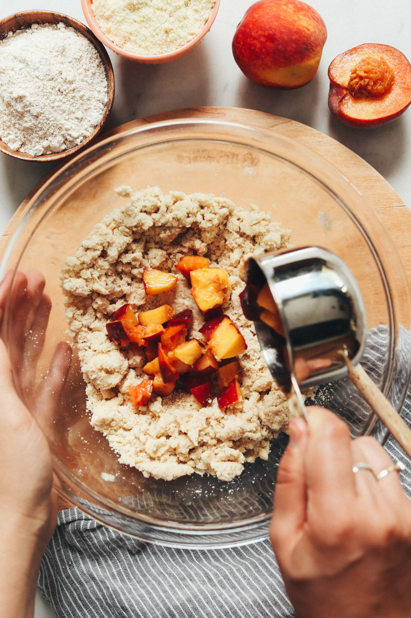 - Quindi aggiungere le pesche a cubetti e mescolare delicatamente fino a distribuirle uniformemente. L’umidità delle pesche legherà maggiormente l’impasto. L’uso di pesche extra mature può renderlo più umido, mentre l’utilizzo di pesche più sode e meno mature può renderlo più secco. Vuoi che l’impasto sia uniformemente umido ma non eccessivamente appiccicoso. Se il tuo impasto è troppo friabile, aggiungi un cucchiaio di latte senza lattosio alla volta. Se è troppo umido/appiccicoso, aggiungi altra farina di mandorle un cucchiaio alla volta.