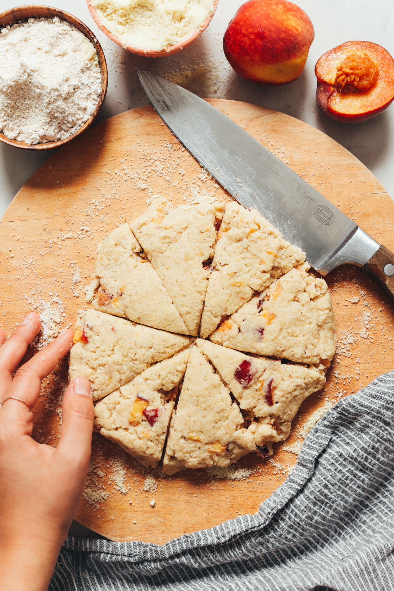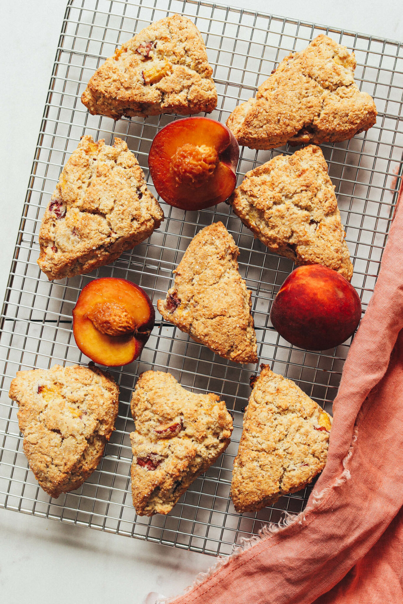 Scones croccanti e burrosi senza glutine tempestate di pesche estive mature! Perfettamente dolci, facili da preparare e solo 10 ingredienti necessari!