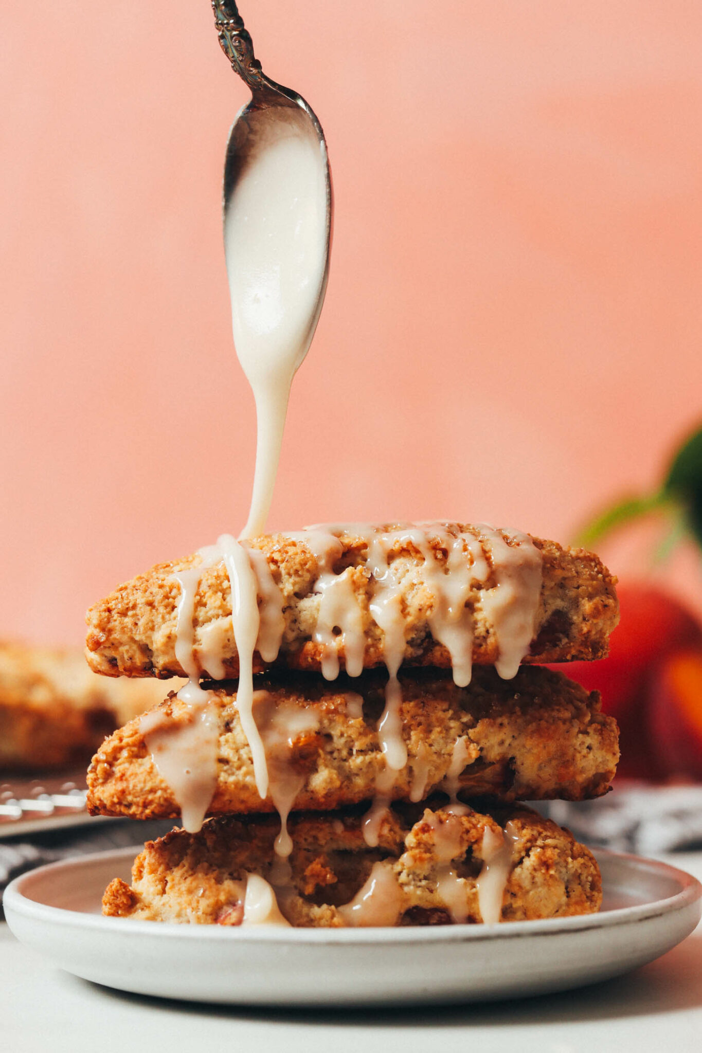 - GLASSA ALLA VANIGLIA: per la glassa opzionale, unire lo zucchero a velo biologico setacciato, l’estratto di vaniglia e il latte senza lattosio a scelta in una ciotola e frullare in una glassa versabile. Se troppo denso, aggiungere altro latte senza latticini. Se troppo sottile aggiungete altro zucchero a velo. Cospargete con gli scones una volta raffreddati. La glassa si indurisce in 30 minuti a 1 ora.
