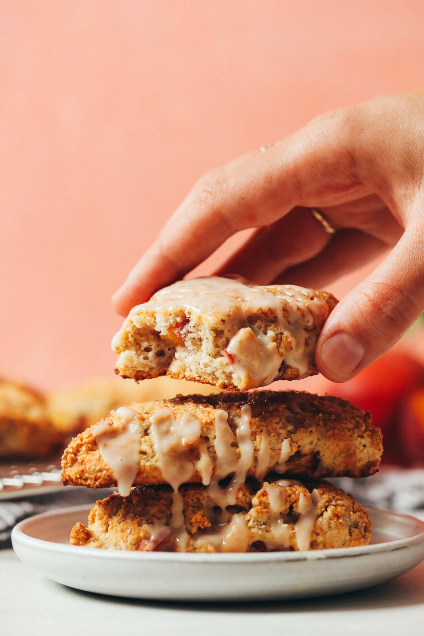 Questi scones alla pesca sono croccanti fuori e teneri dentro grazie al perfetto equilibrio di farine senza glutine (l’abbiamo inchiodato con i nostri scones ai mirtilli senza glutine). Ma se non sei senza glutine, pensiamo che anche la farina per tutti gli usi funzionerebbe magnificamente (vedi questa ricetta come guida).