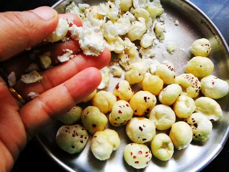 La frutta secca Makhana è anche conosciuta con il nome di “semi di loto” o “noci di volpe”. Questi sono i semi dell’Euriale ferox, una pianta che cresce nelle zone di acqua stagnante dell’Asia orientale.