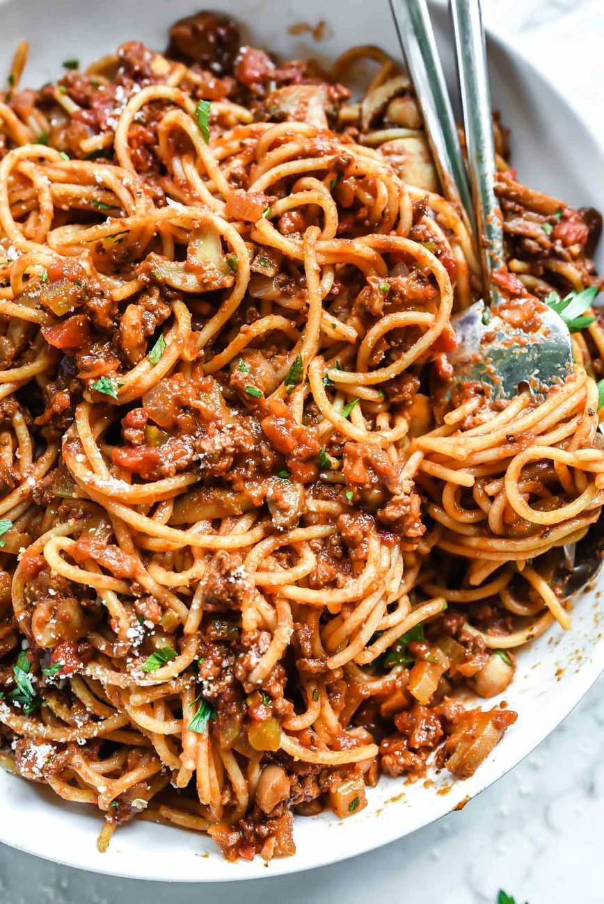 In un tegame scaldate l’olio, unite le cipolle affettate e un po’ di sale. Lasciate appassire le cipolle e mettete uno spicchio di aglio pestato, una manciata di prezzemolo tritato, regolate di sale e pepe. Appena l’aglio prende colore versate i pomodori a pezzi e la carne macinata, continuate la cottura a fuoco lento, finché tutto sia perfettamente amalgamato. Passate al setaccio, rimettete sul fuoco e unite il dado sciolto in un po’ di acqua calda, la farina e mescolate; aggiungete quindi ancora del burro. Lessate gli spaghetti in abbondante acqua salata, scolateli al dente e conditeli con la salsa. Mescolate bene e servite subito.