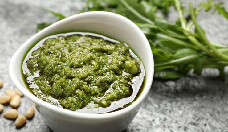 Cominciamo con il pesto di rucola. Dopo aver lavato e asciugato la rucola, sminuzzatela e mettetela in un boccale. Aggiungete i pinoli, il formaggio grattugiato, l’olio extravergine d’oliva e il sale. Frullate il tutto fino a ottenere un pesto cremoso.
