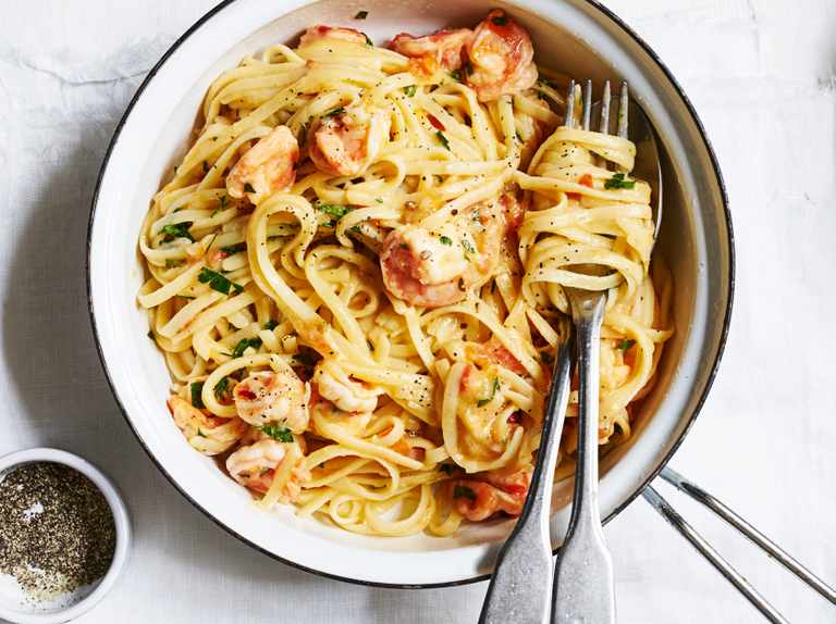 Fate soffriggere nell’olio d’oliva bollente l’aglio e il porro. Mescolate e quando il porro si sarà ben intenerito aggiungete i gamberi e tutti gli ingredienti indicati nella ricetta. Mescolate e proseguite la cottura finché i gamberi non si saranno ben dorati. Lessate la pasta in abbondante acqua salata e in ebollizione. A cottura avvenuta, scolatela e conditela con il sugo ai gamberi. Servite la pasta subito in tavola.