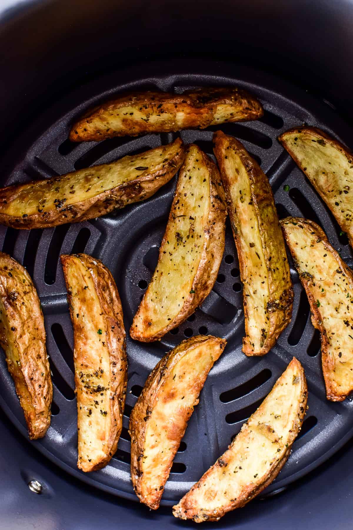 Frittura ad aria: trasferisci le fette di patate condite nel cestello della friggitrice ad aria in un unico strato. Friggere ad aria a 400°F (204°C) per 12-15 minuti, girando a metà cottura. Ripeti se necessario fino a quando tutti gli spicchi di patate sono finiti.